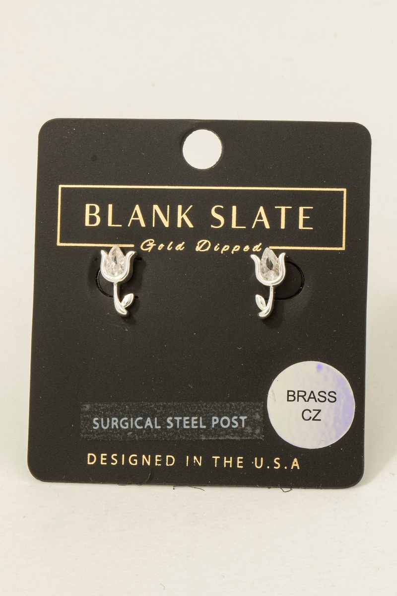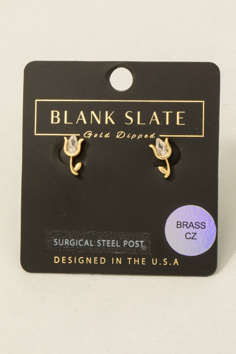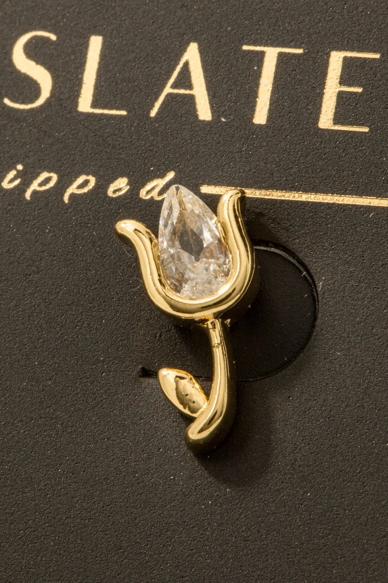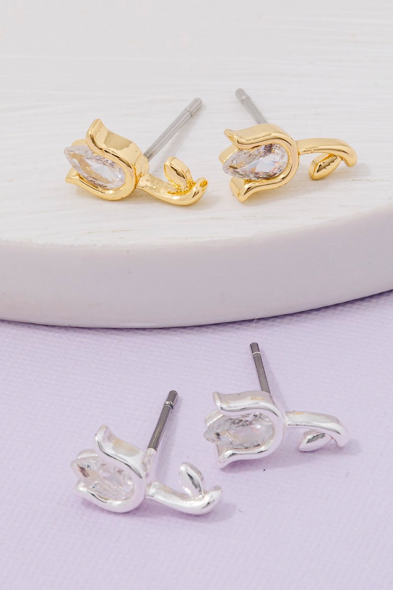 • This pair of stud earrings introduces a unique gold dipped cubic zirconia teardrop tulip style. Experience refined sophistication with this understated yet stylish piece.
