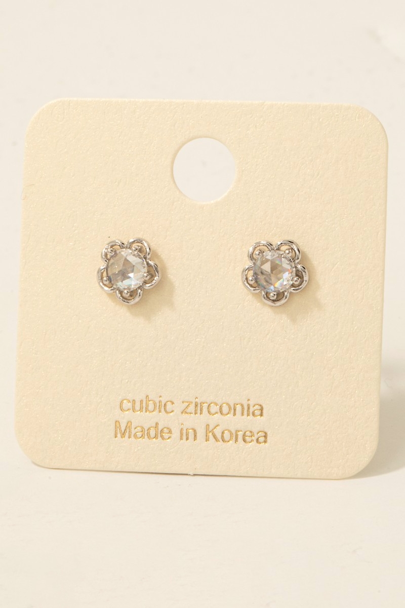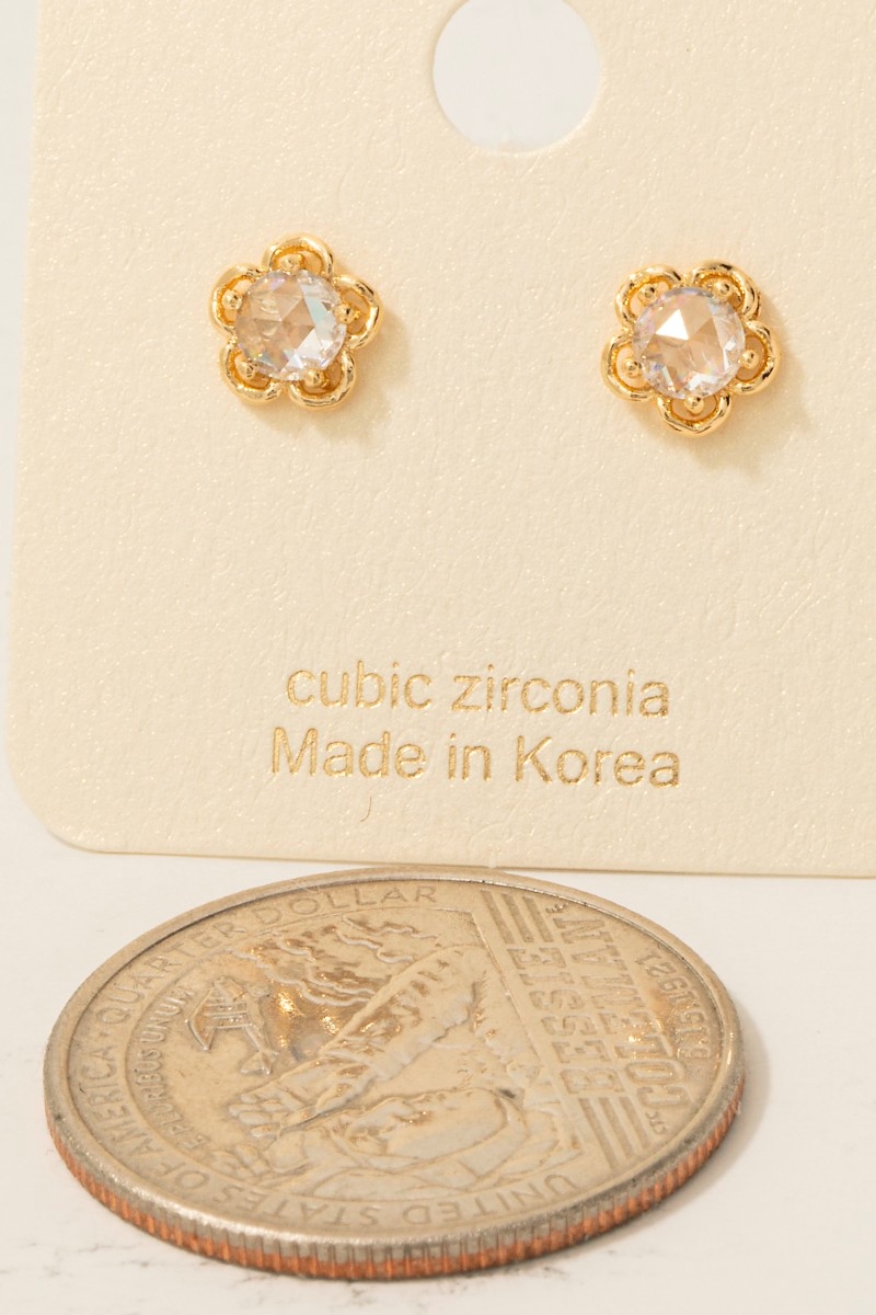 • This pair of stud earrings displays a fashionable gold dipped intricate cubic zirconia flower style. Witness the perfect fusion of style and functionality as this pair of stud earrings effortlessly complements your lifestyle.