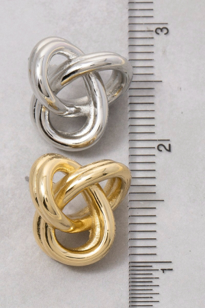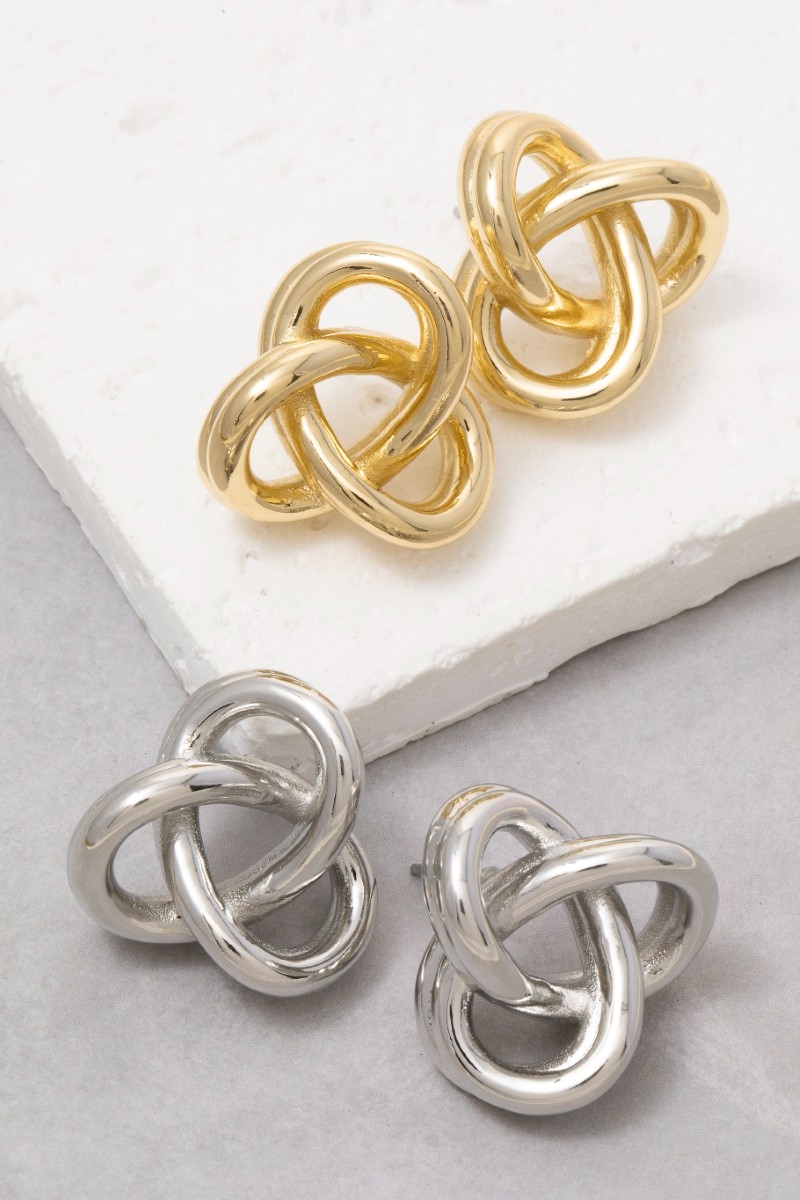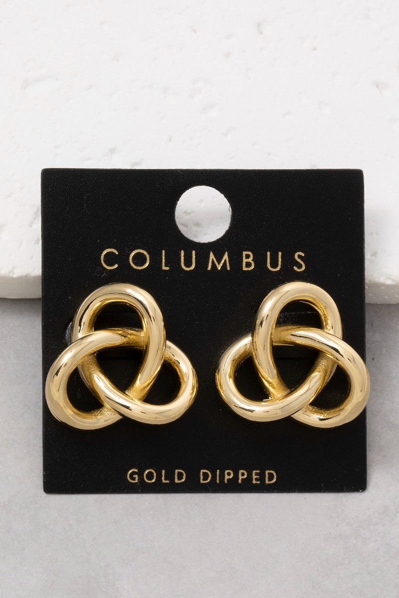 • This pair of stud earrings displays a vibrant gold dipped intricate knot style. Immerse yourself in fashion finesse with this statement pair of stud earrings.