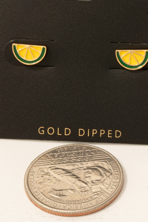 • This pair of stud earrings displays a vibrant gold dipped lime style. Immerse yourself in the world of understated glamour as this pair of stud earrings effortlessly exudes timeless appeal.