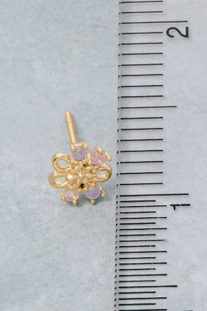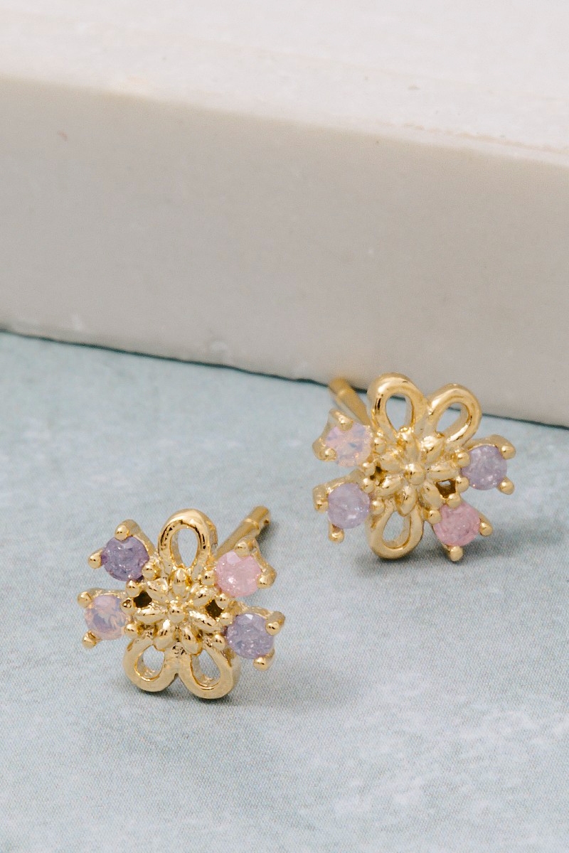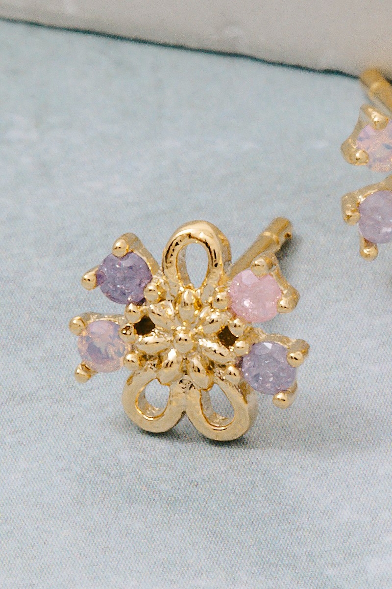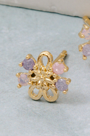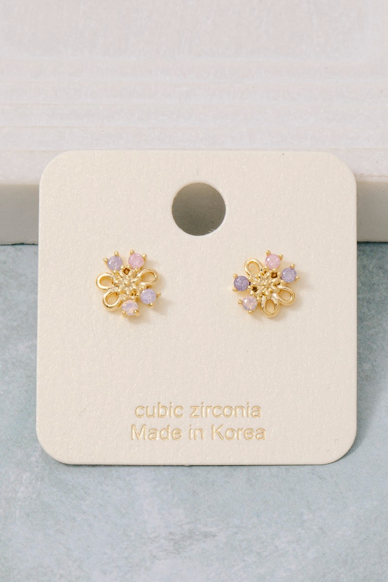• This pair of stud earrings introduces a unique gold dipped mini cubic zirconia flower style. Celebrate the art of accessorizing with this piece that effortlessly encapsulates modern trends.