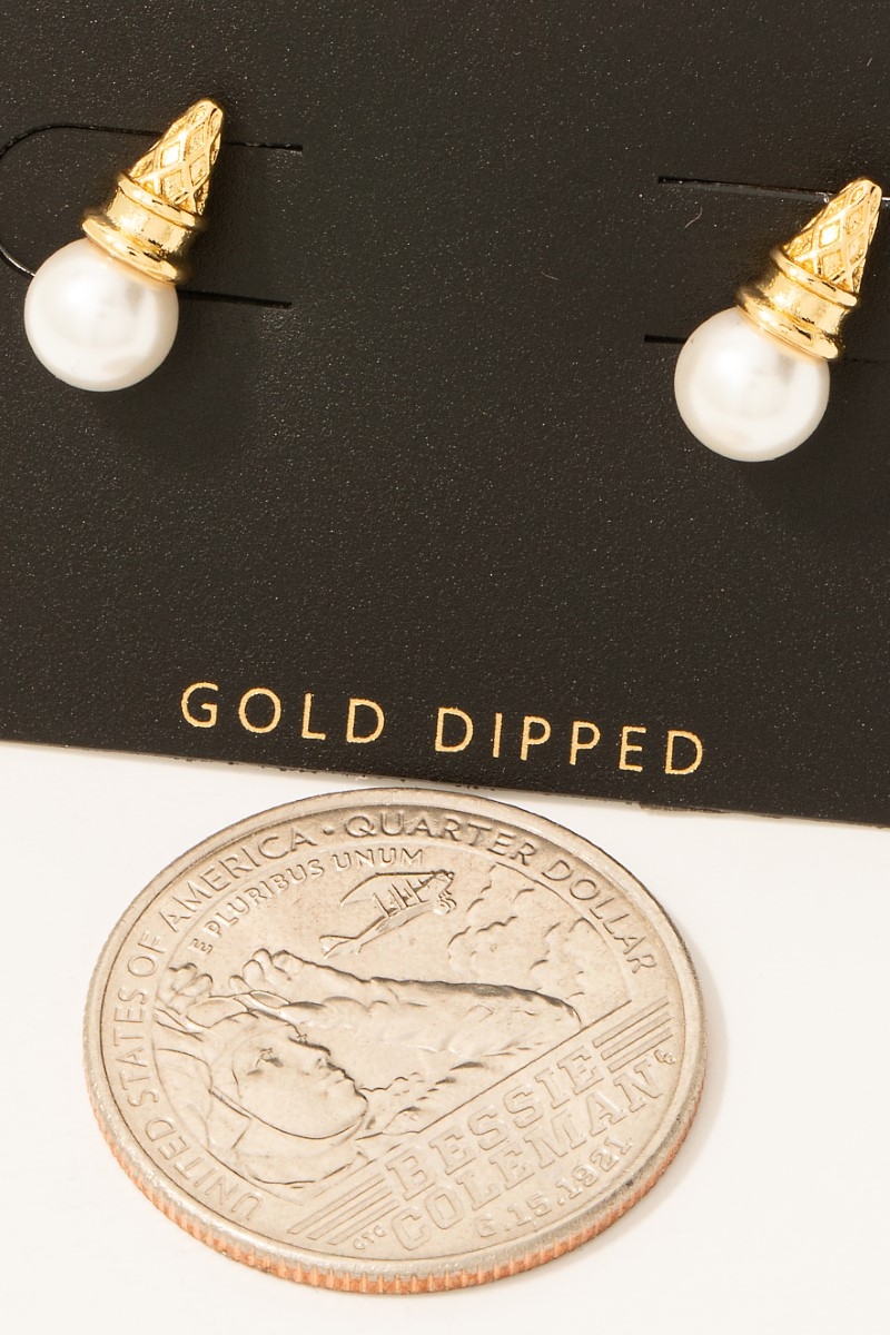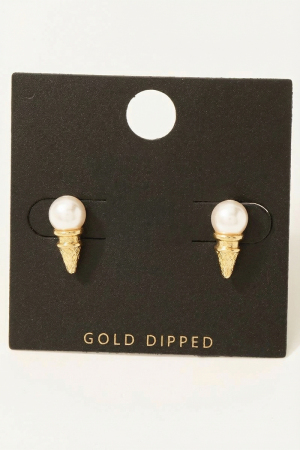 • This pair of stud earrings showcases a unique gold dipped pearl ice cream cone style. Experience refined sophistication with this understated yet stylish piece.