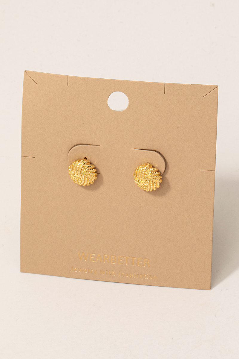 • This pair of stud earrings displays a fashionable gold dipped textured knot style. Unveil modern elegance with this subtly intricate pair of stud earrings.