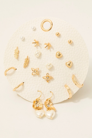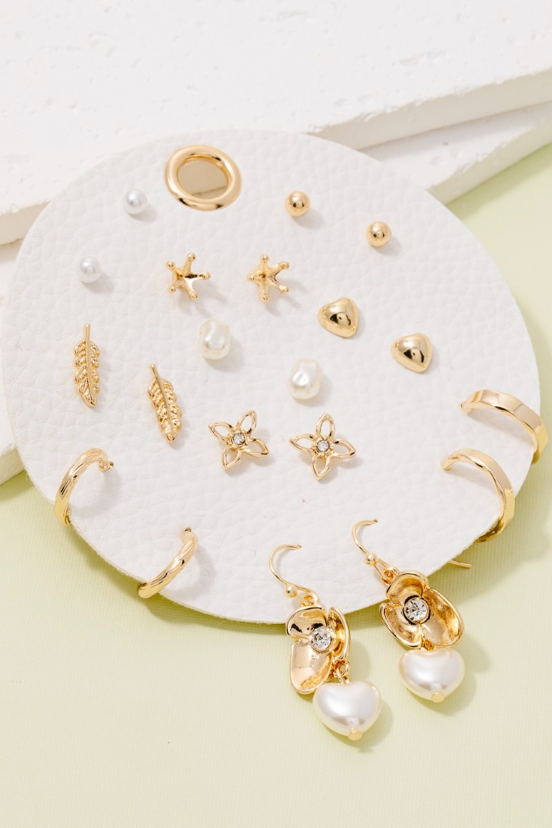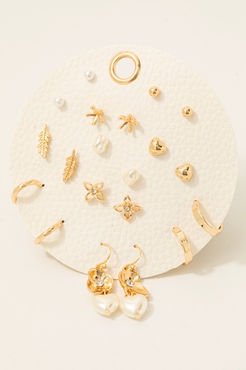 • This pair of stud earrings adds a modern heart floral and pearl 10 pair set style. Indulge in the allure of exquisite craftsmanship as this pair of stud earrings effortlessly adds a touch of luxury to your attire.