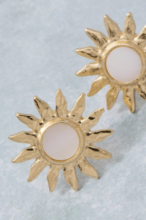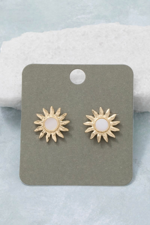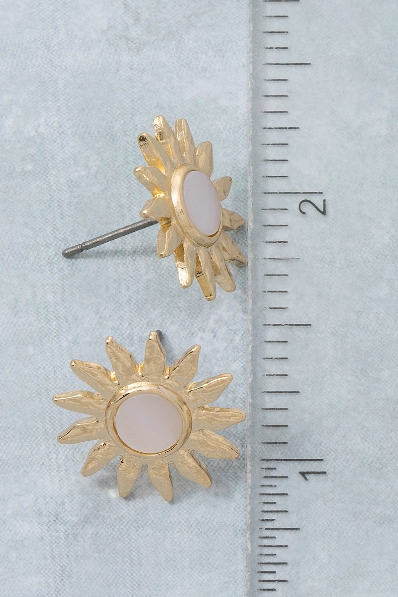 - This pair of stud earrings features a fashionable mother of pearl sun style. Revel in the intricate design that effortlessly distinguishes this pair of stud earrings, making it a statement piece.