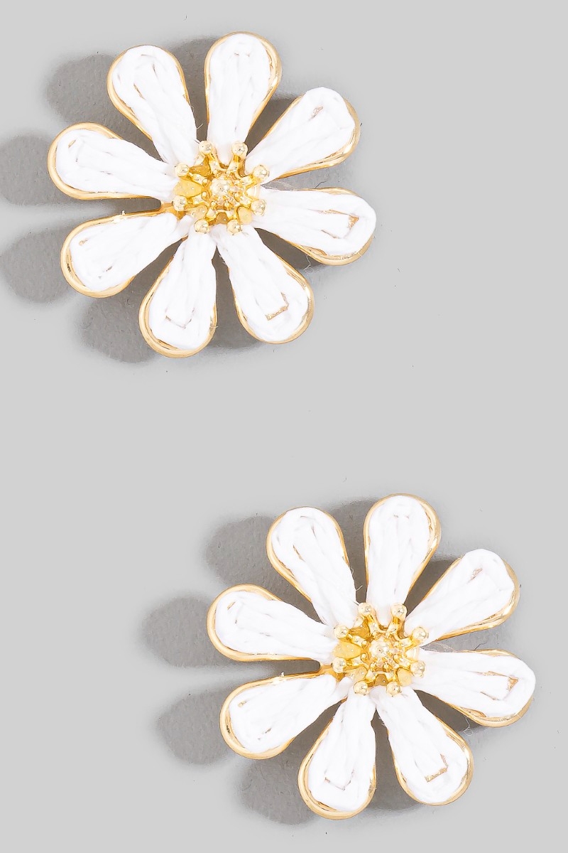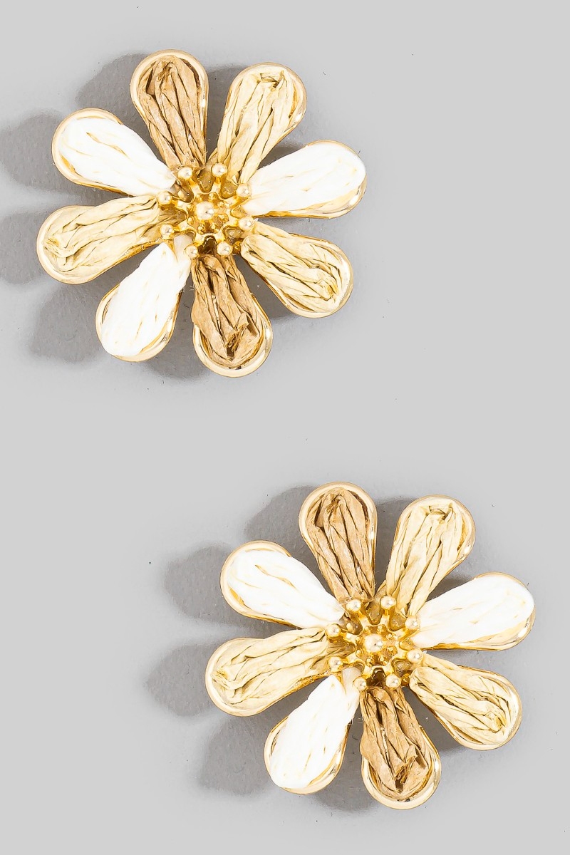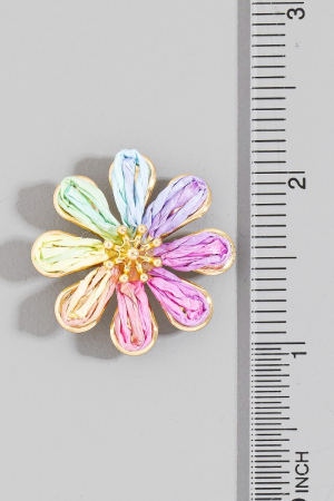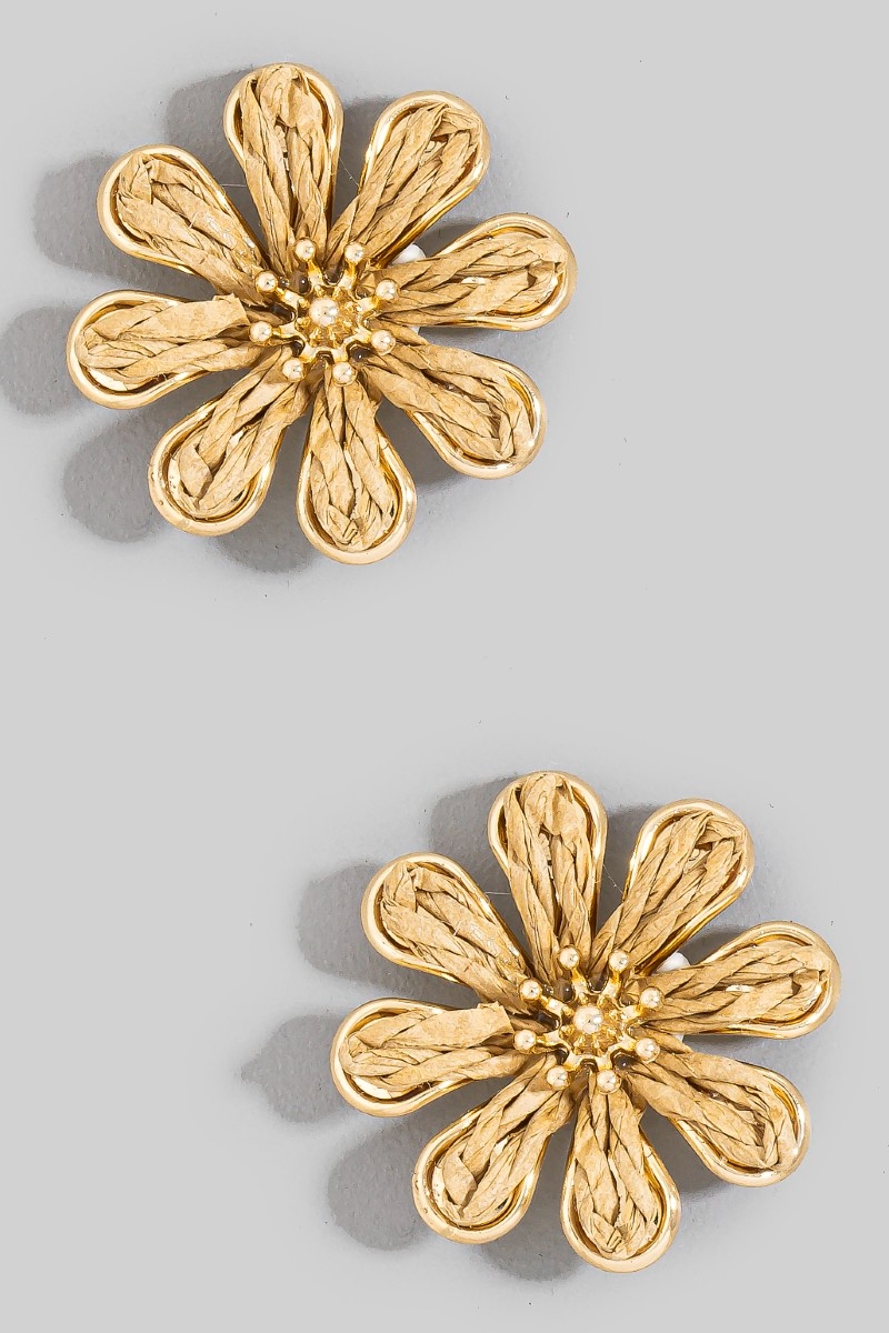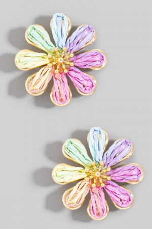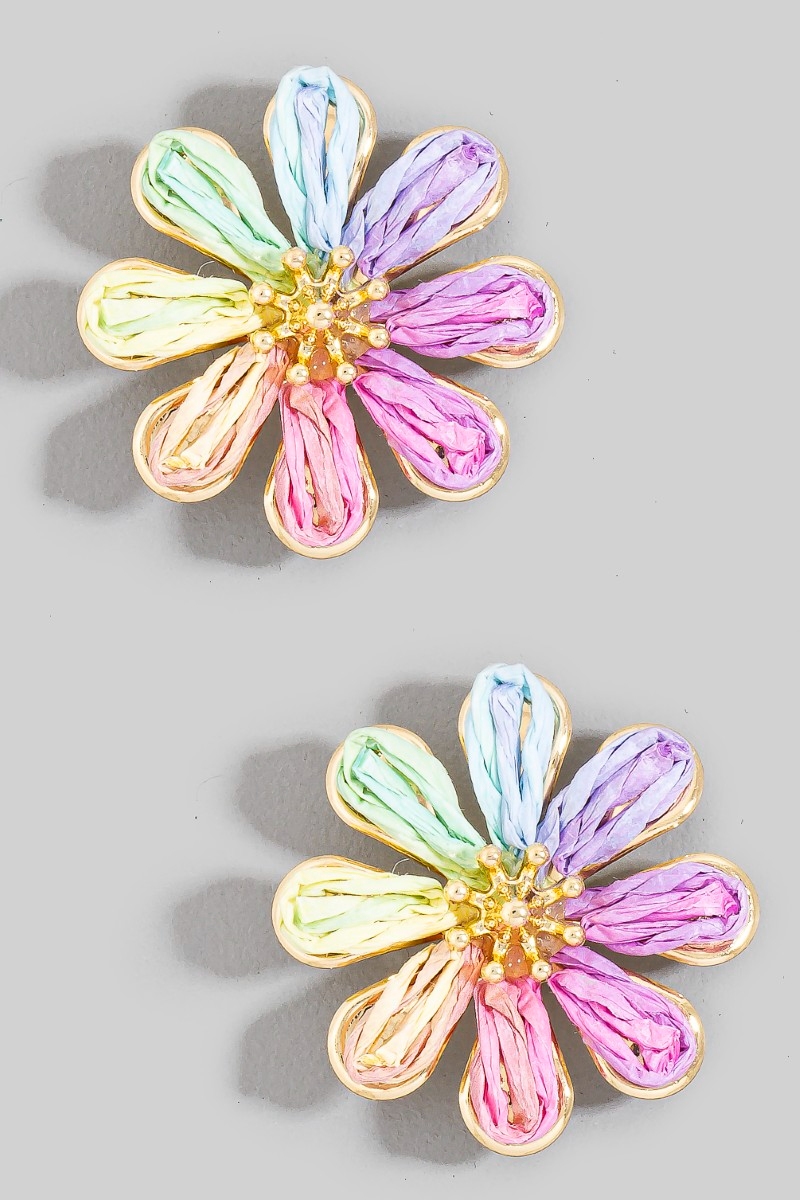 • This pair of stud earrings showcases a timeless multi tone raffia flower style. Discover the perfect balance of functionality and fashion.