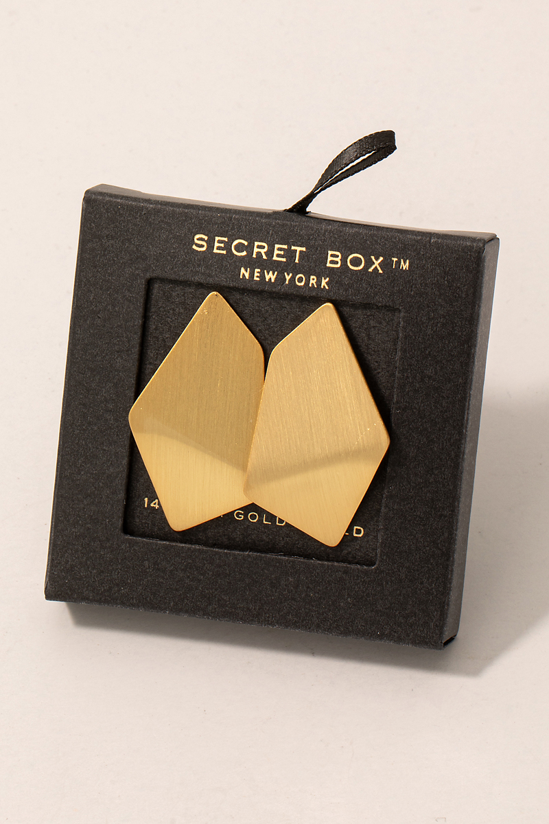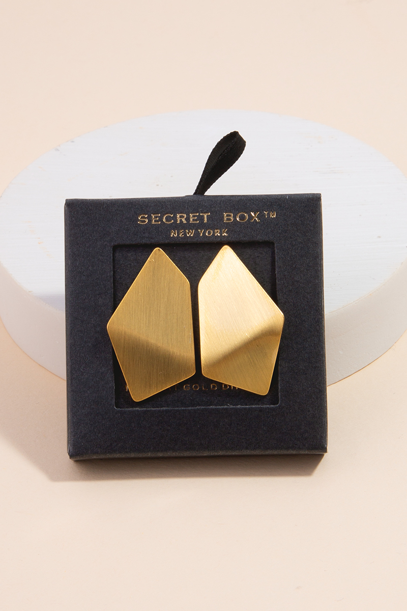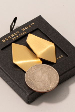 • This pair of stud earrings brings a unique secret box gold dipped brushed geometric shield style. Indulge in the artistry of accessorizing with this unique piece.
