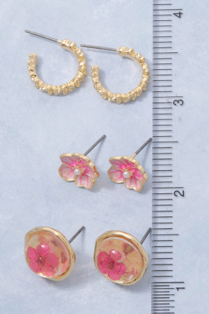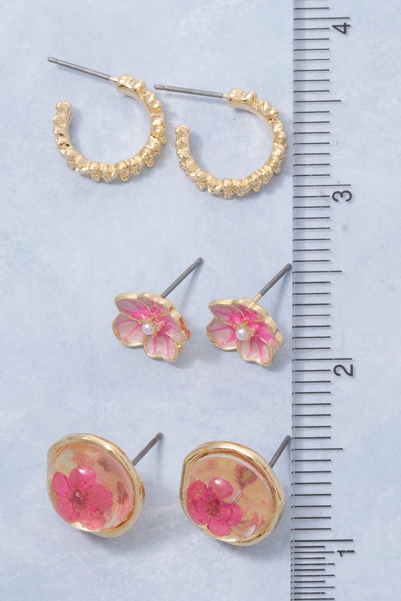 - This pair of earrings brings a unique three pair resin pressed flower set style. Indulge in the artistry of accessorizing with this unique piece.