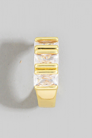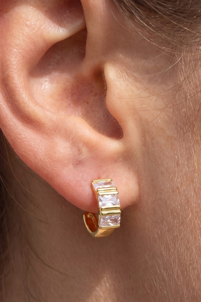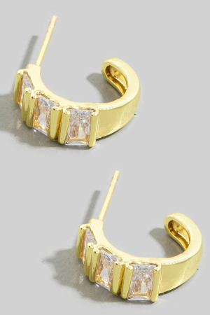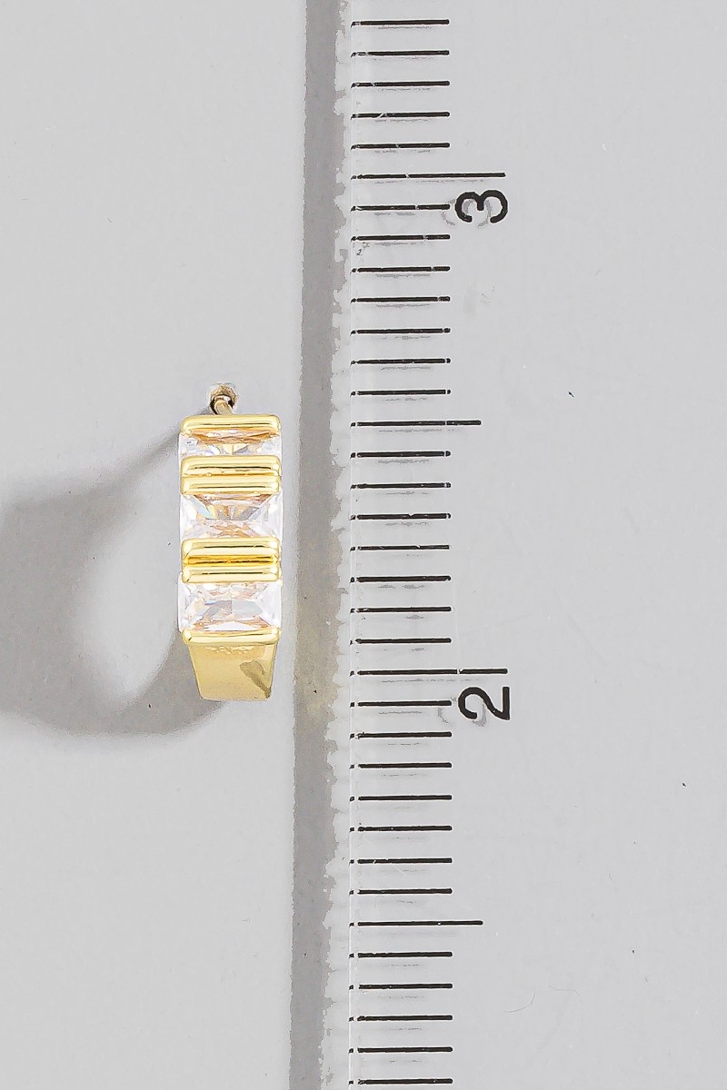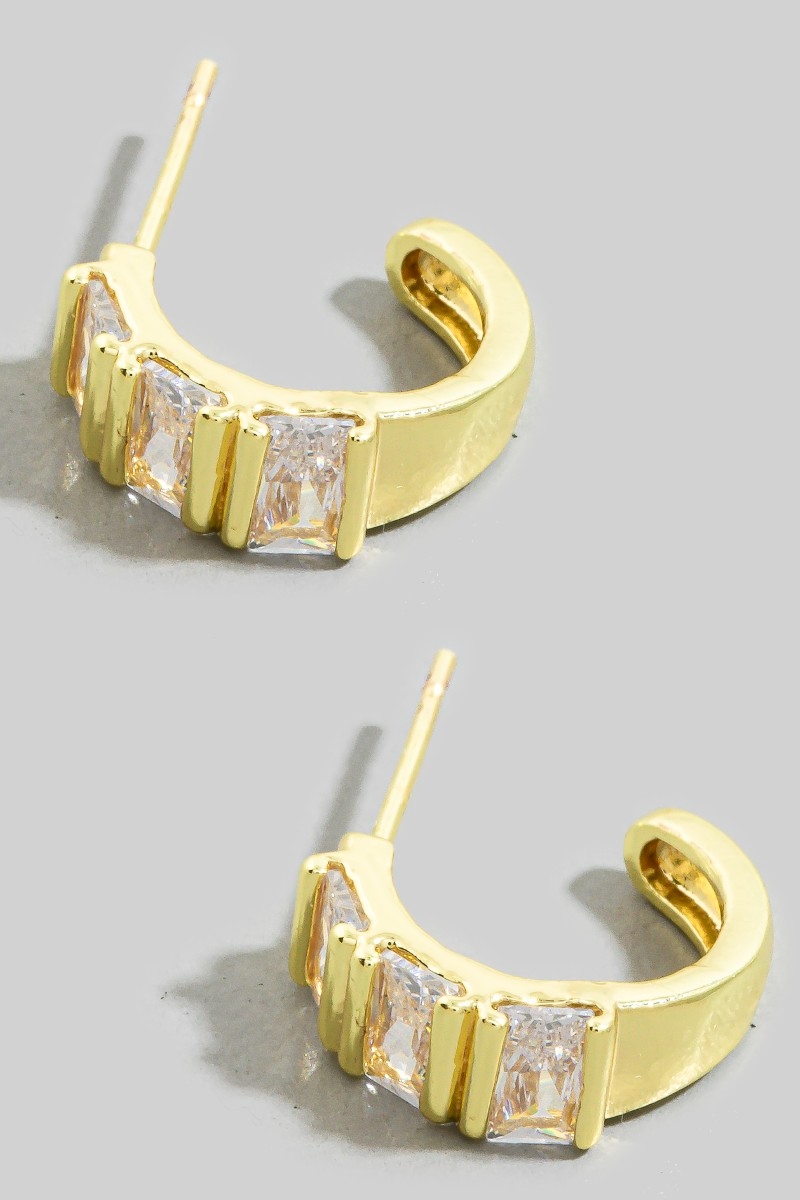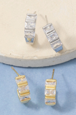• This pair of hoop earrings adds a modern triple baguette cubic zirconia bar huggie style. Indulge in the allure of exquisite craftsmanship as this pair of hoop earrings effortlessly adds a touch of luxury to your attire.