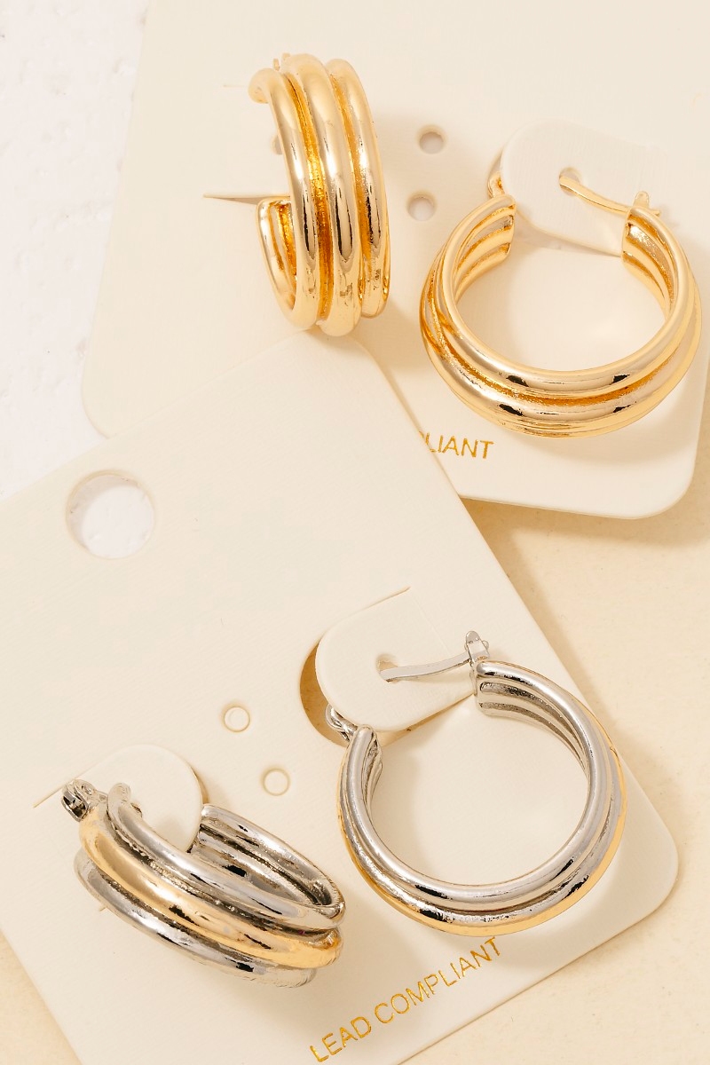 • This pair of hoop earrings brings a unique triple layered latch style. Elevate your ensemble with this pair of hoop earrings that effortlessly captures the essence of refined fashion.