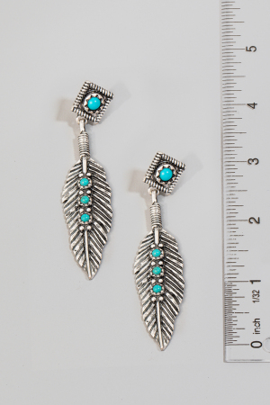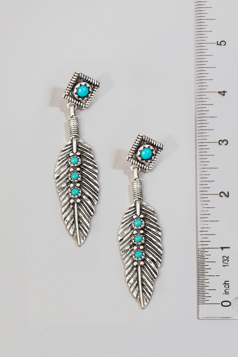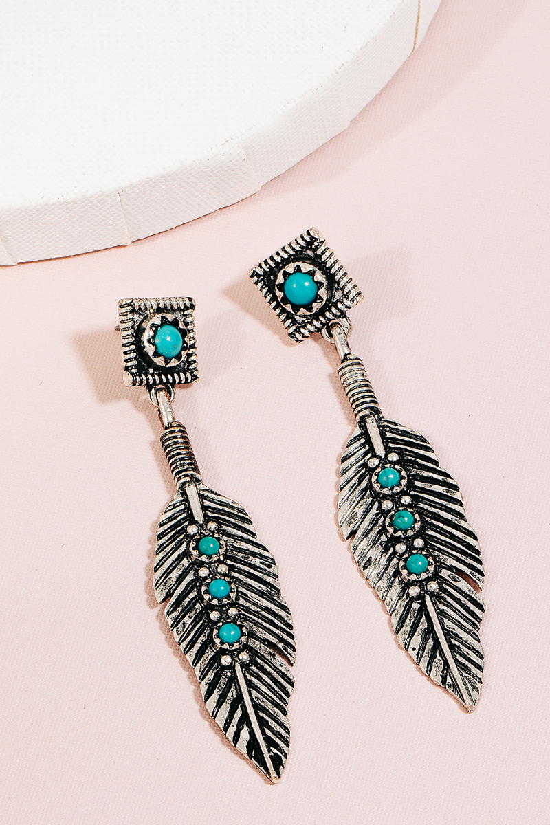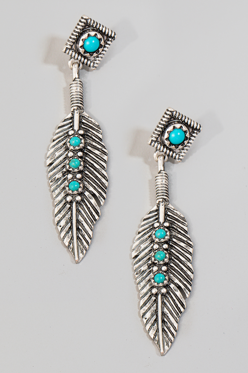 - This pair of dangle earrings brings a stunning turquoise stone studded feather style. Elevate your ensemble with this chic, timeless pair of dangle earrings.