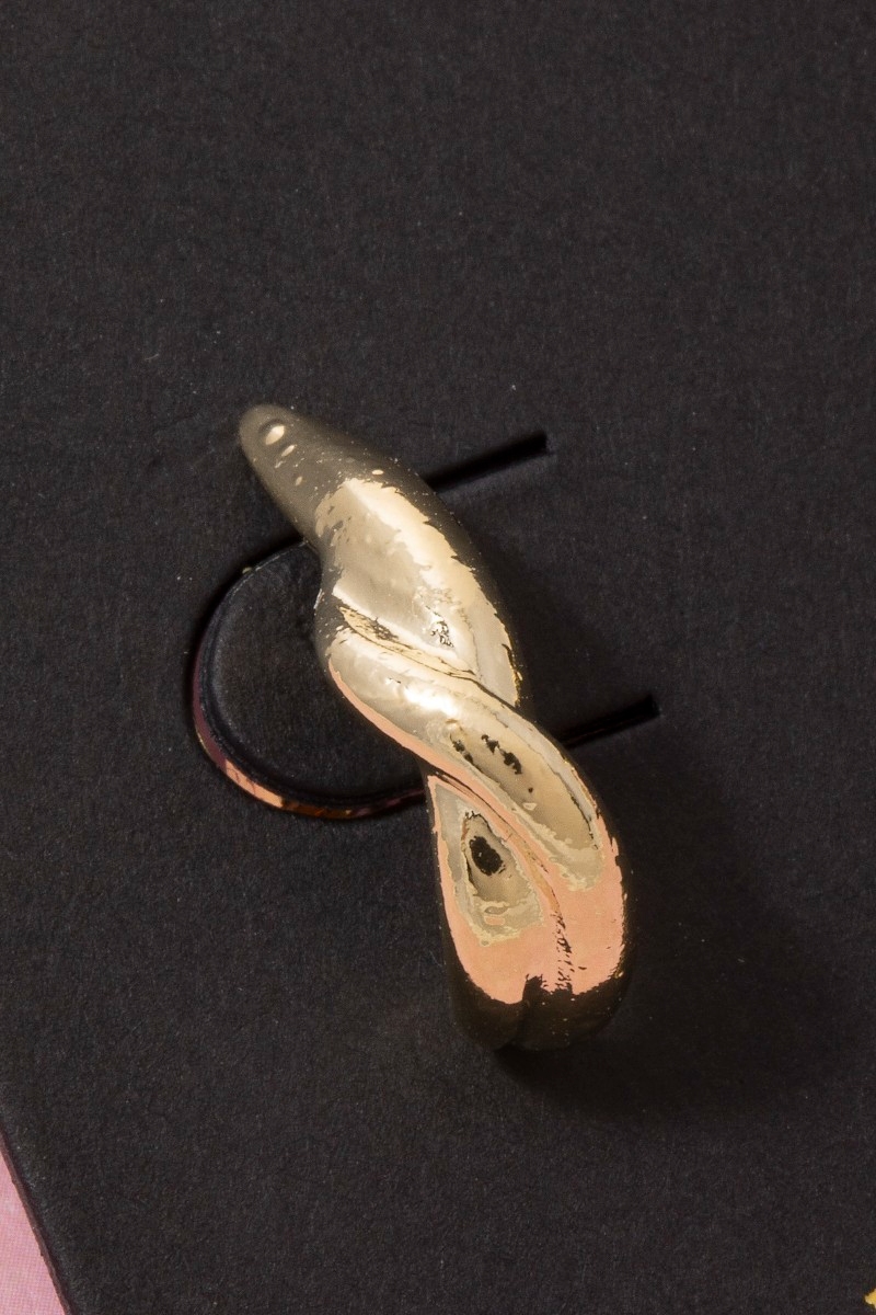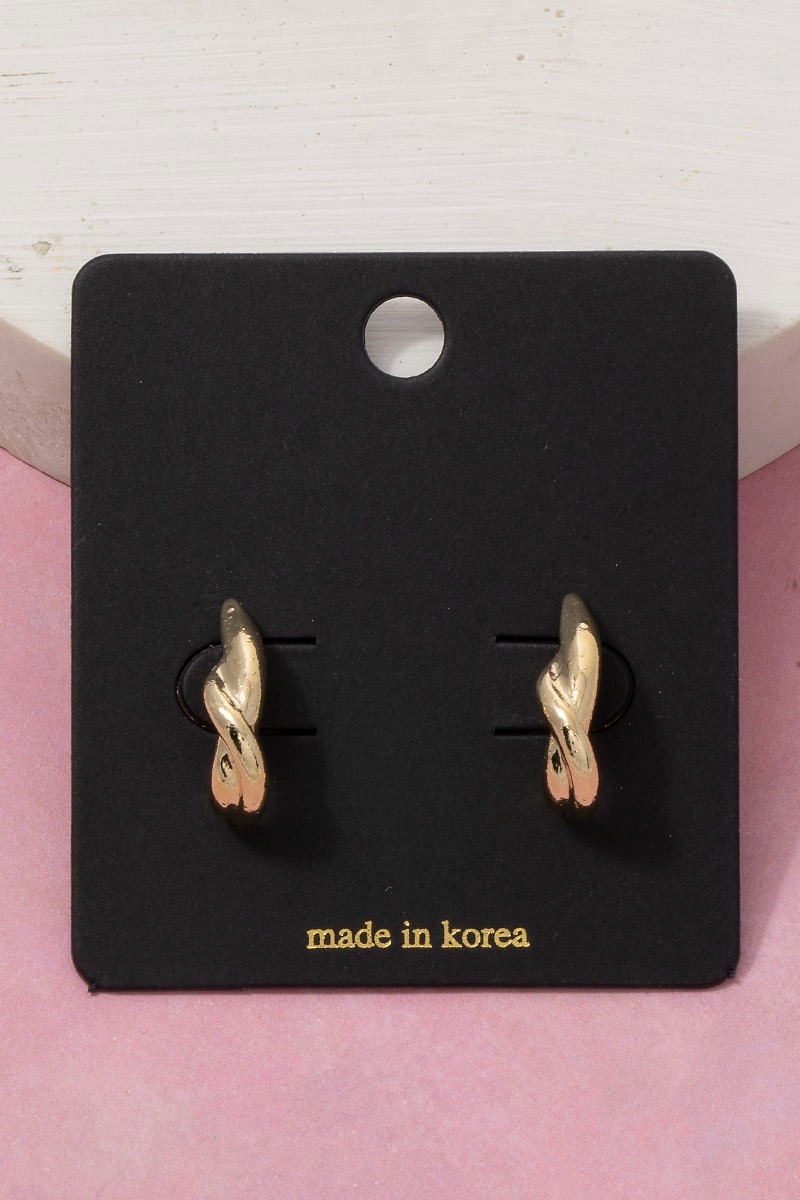 - This pair of hoop earrings features a fashionable twisted knot huggie style. Indulge in the allure of exquisite craftsmanship as this pair of hoop earrings effortlessly adds a touch of luxury to your attire.