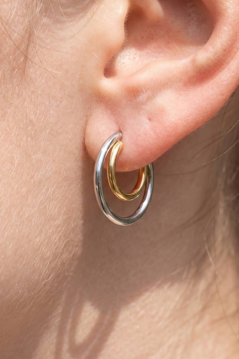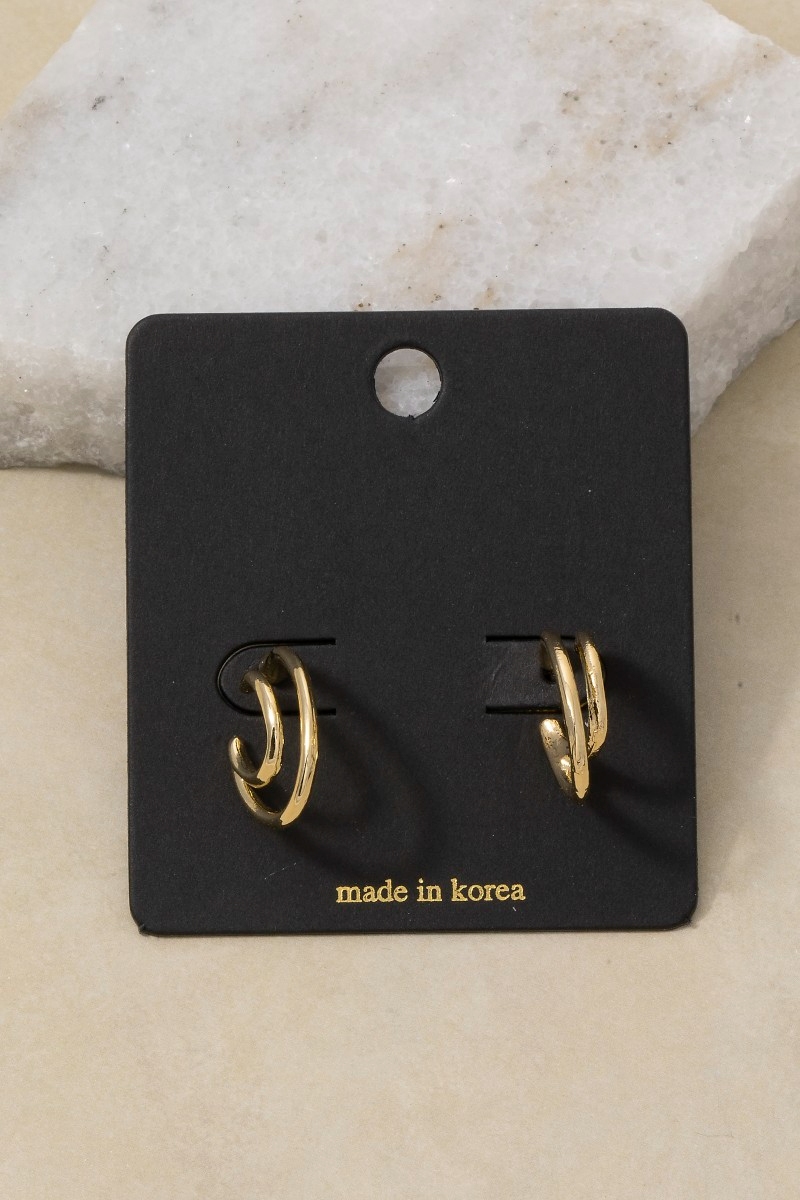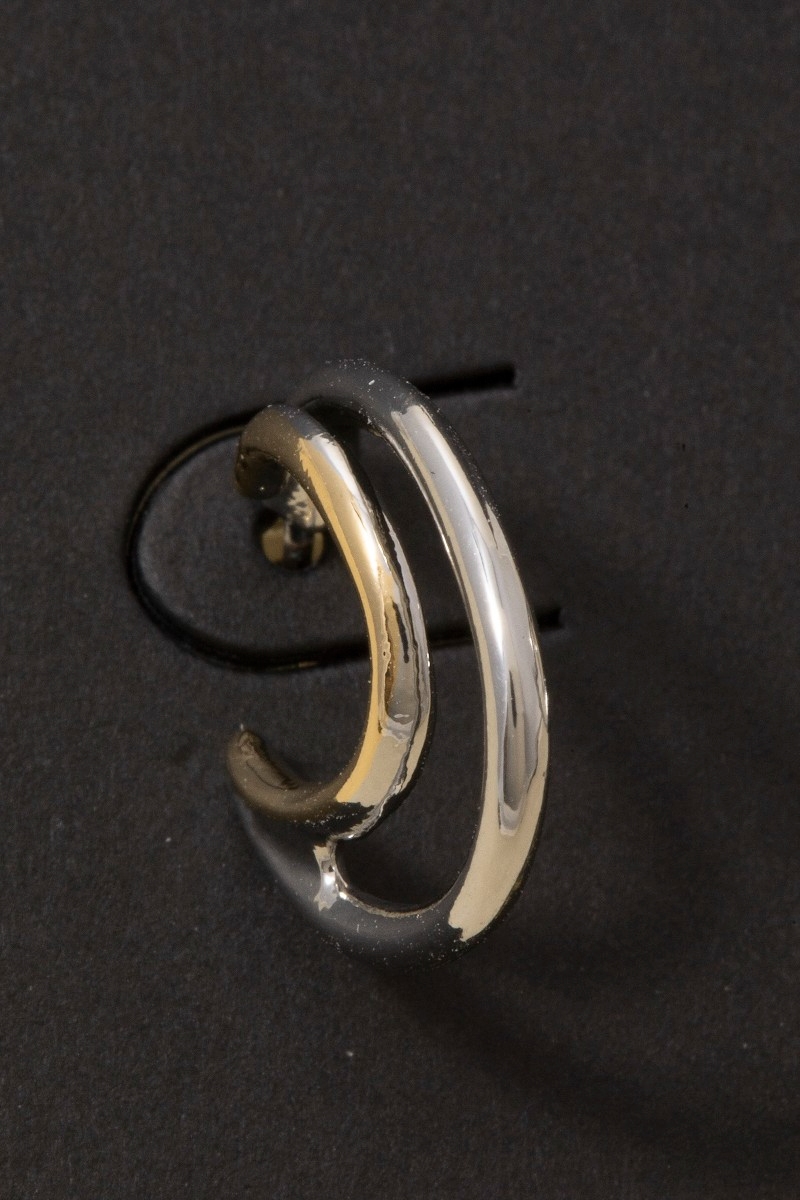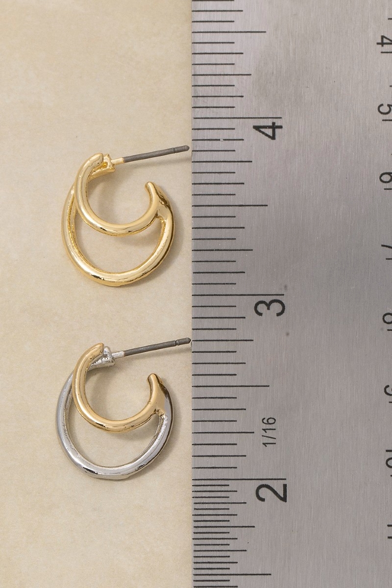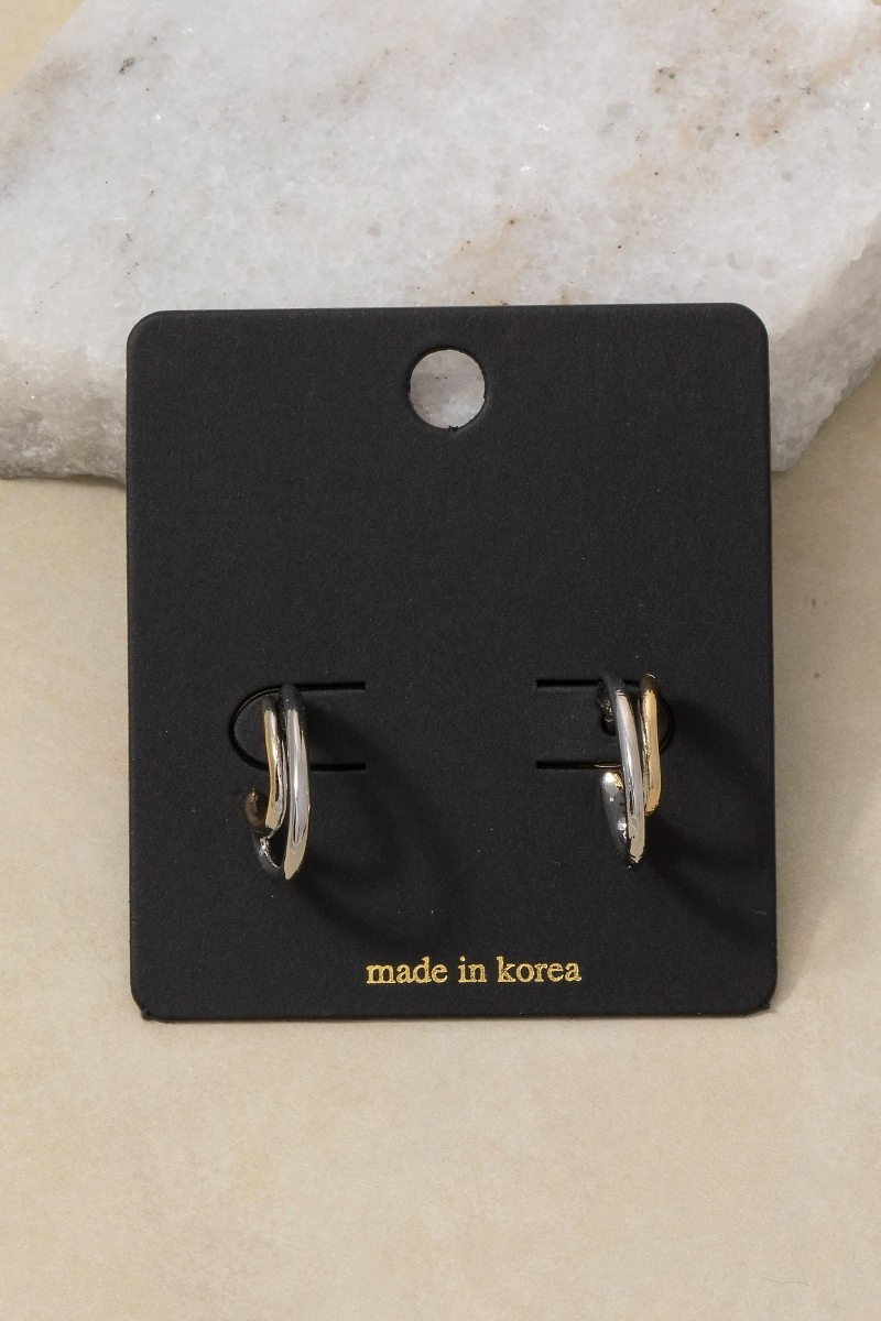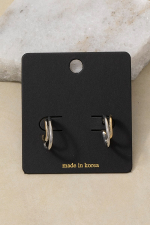 - This pair of earrings showcases a timeless two-tone double curved bar huggie style. Delight in the nuanced details that make this pair of earrings a testament to fine design and impeccable taste.