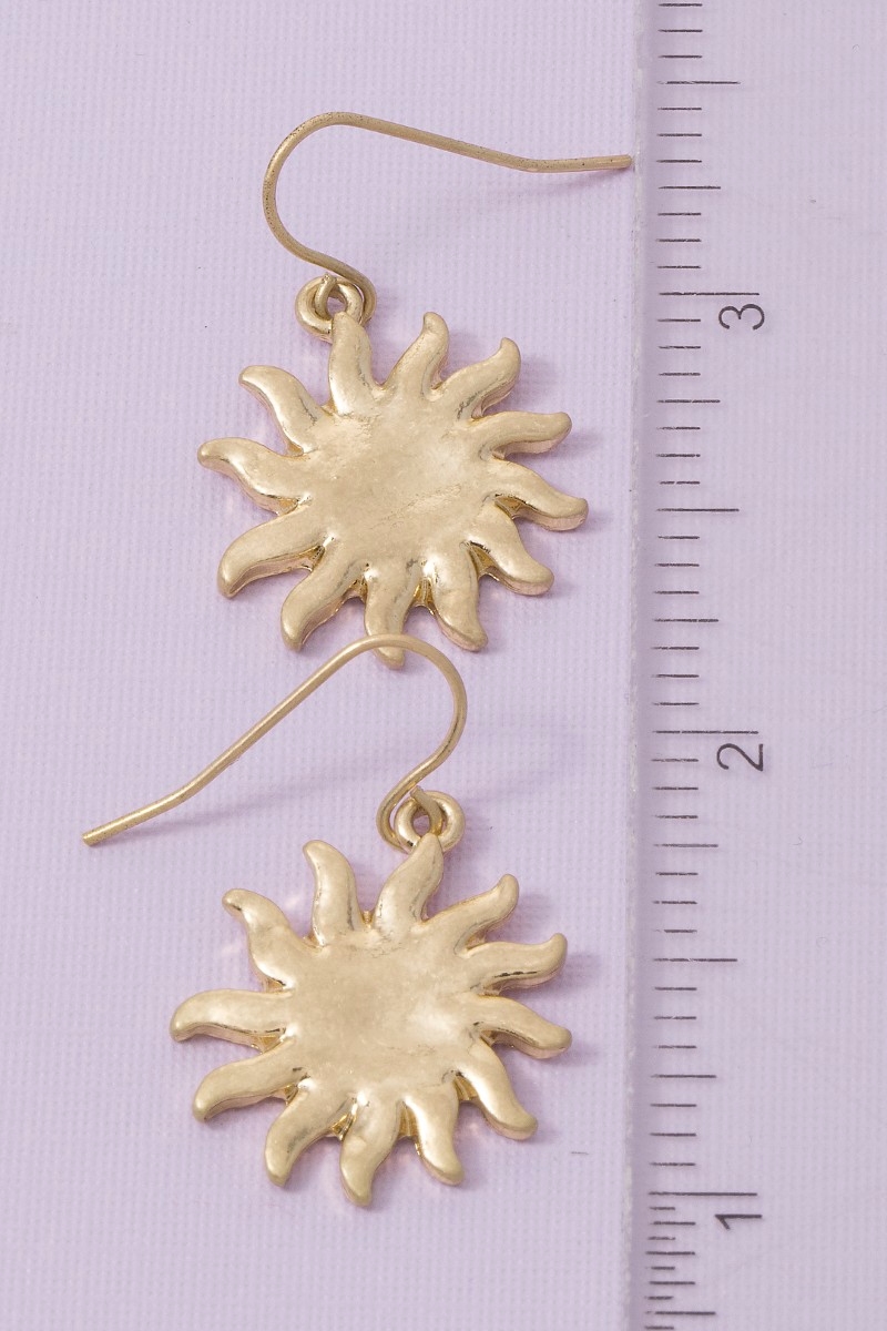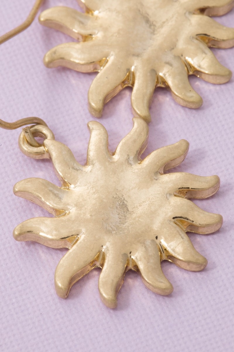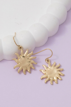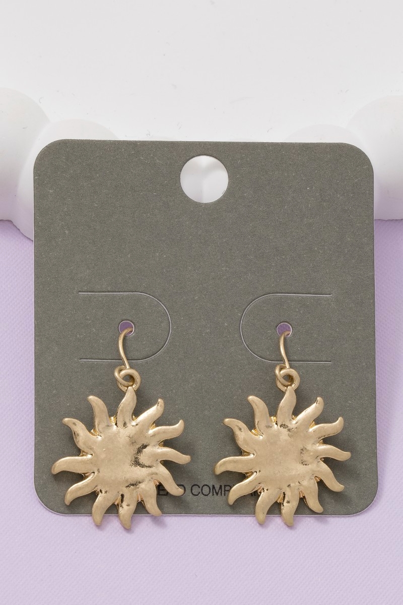 • This pair of dangle earrings displays a vibrant vintage metallic sun style. Delight in the intricate details that make this pair of dangle earrings an essential element in expressing your fashion identity.