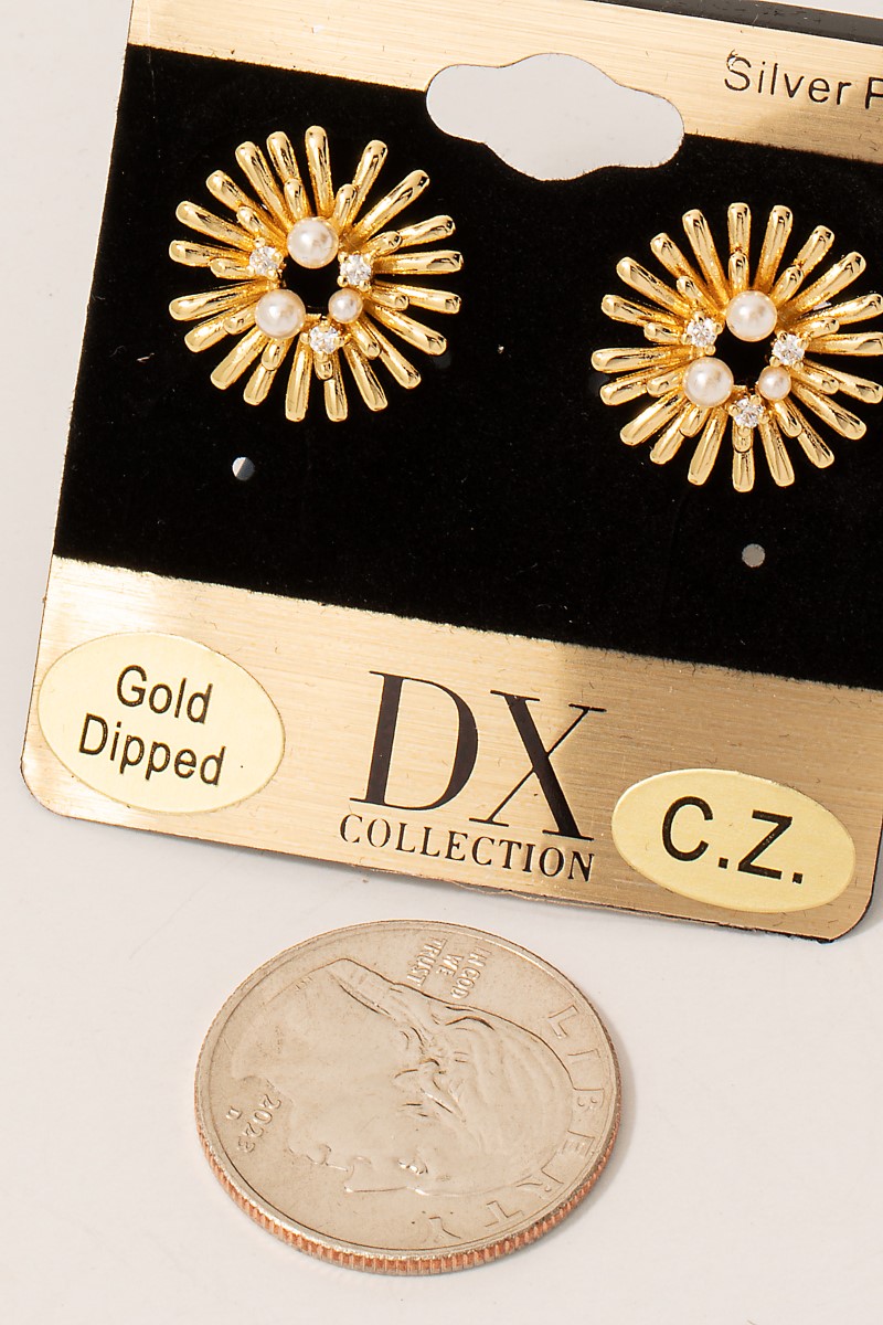 - This pair of stud earrings introduces a unique gold dipped cz and pearl sunburst style. Discover the perfect balance of functionality and fashion.