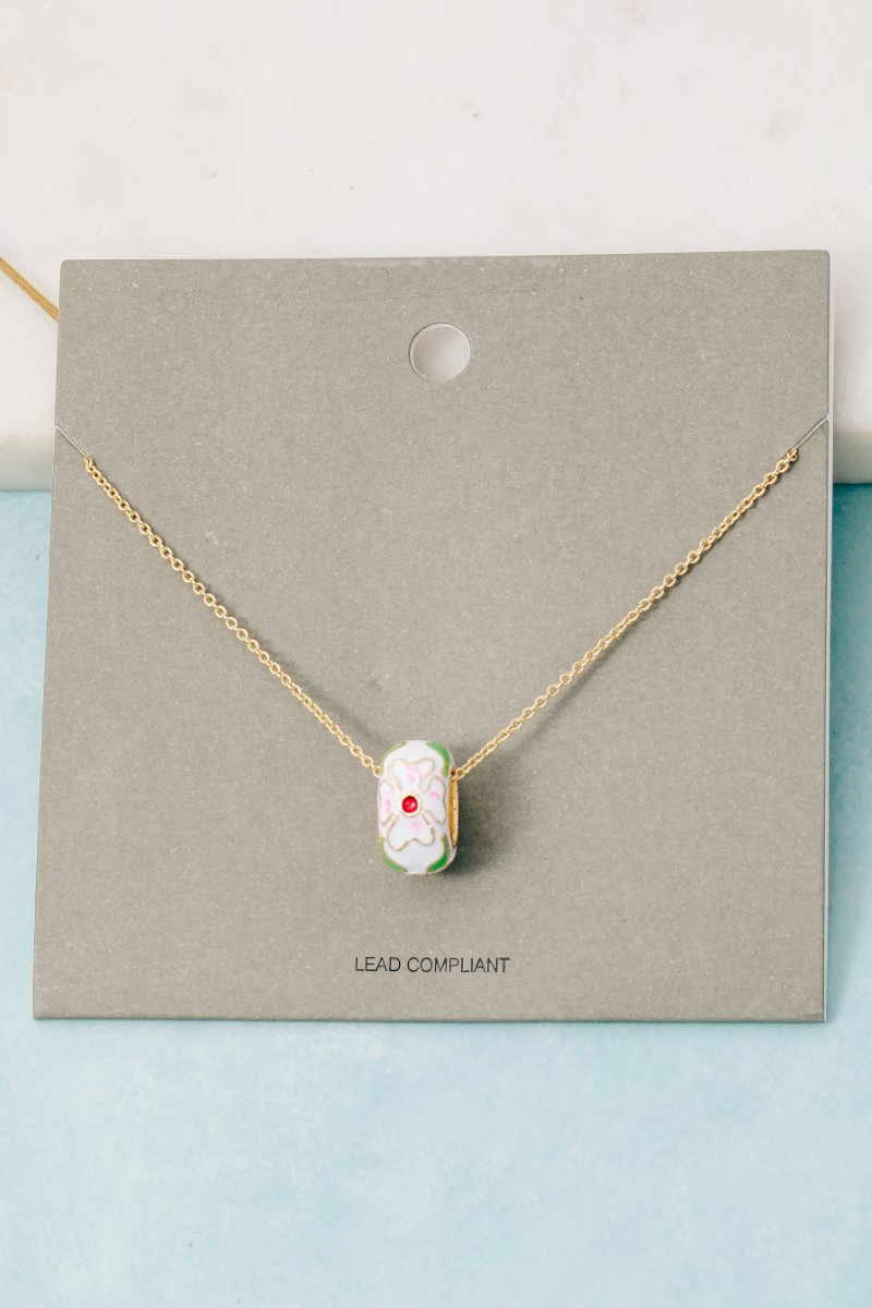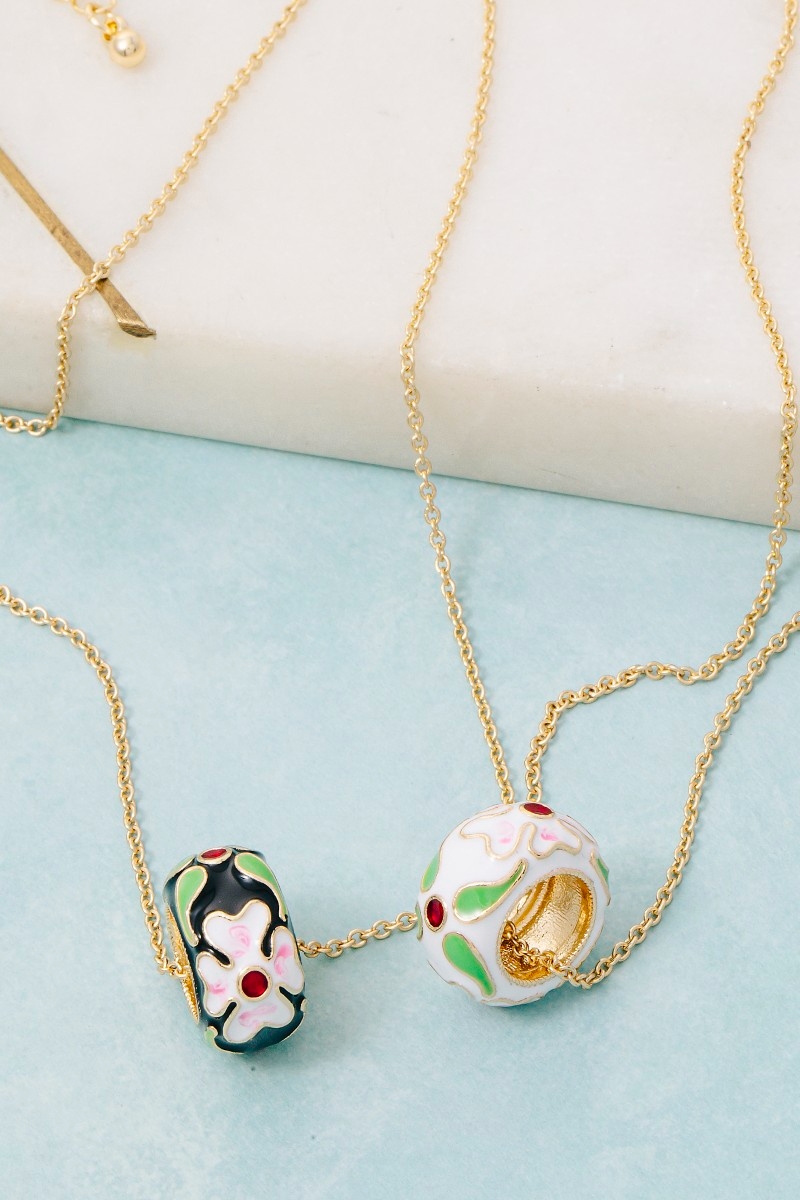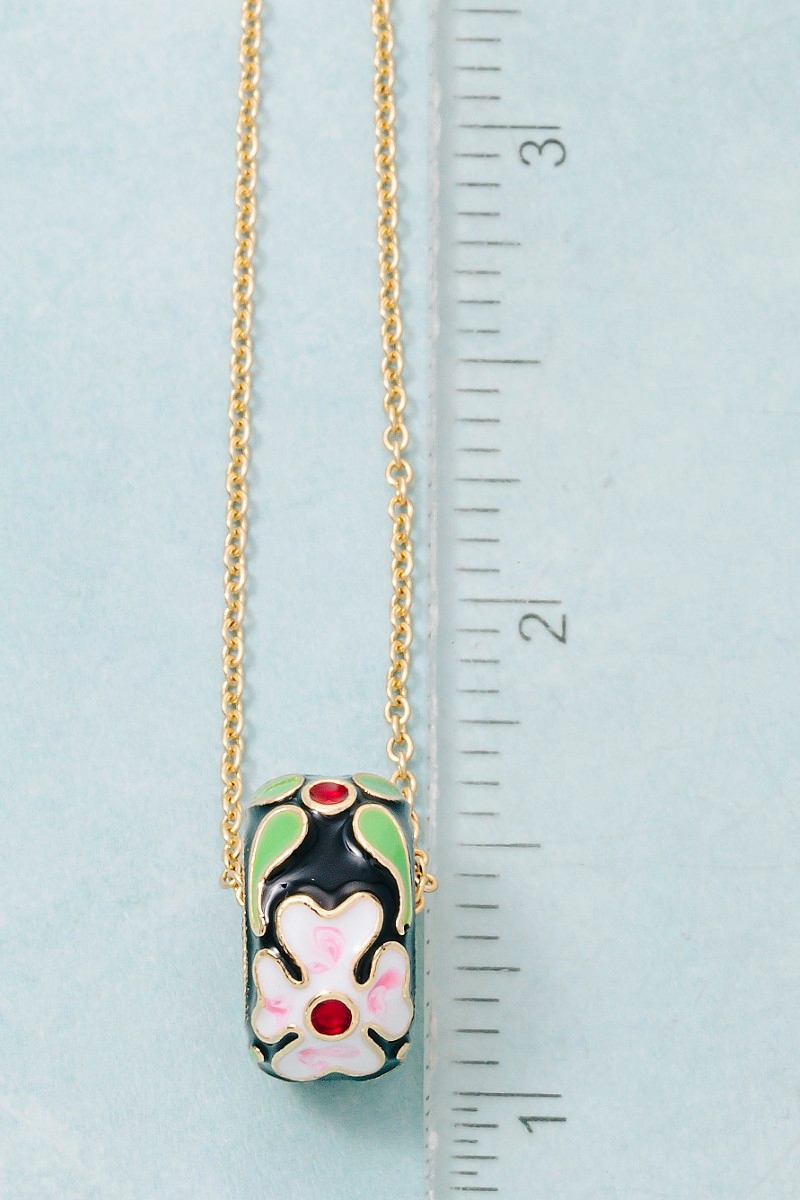 - This necklace brings a luxurious floral enamel hoop pendant style. Revel in the intricate design that effortlessly distinguishes this necklace, making it a statement piece.