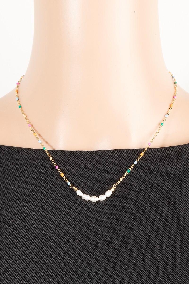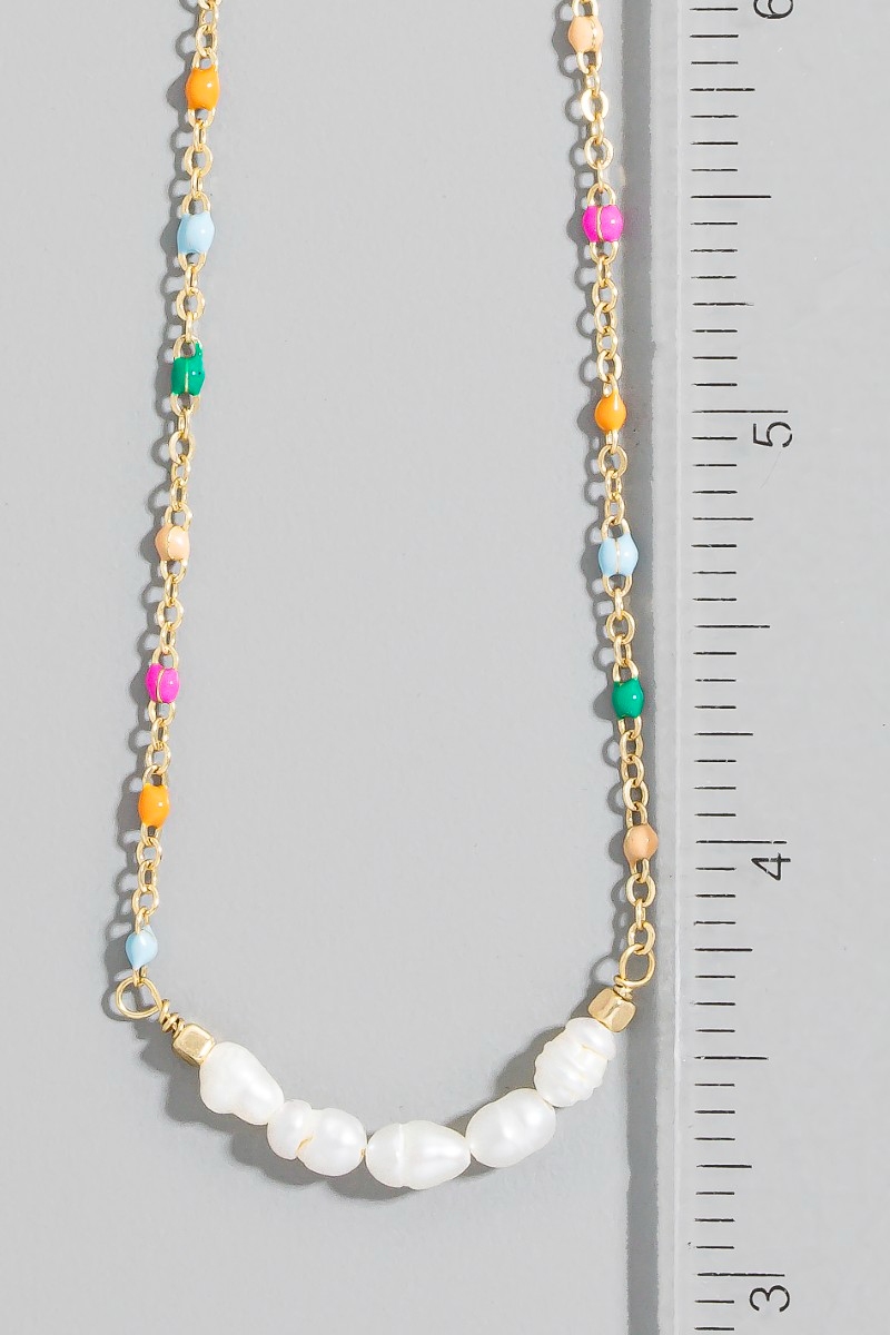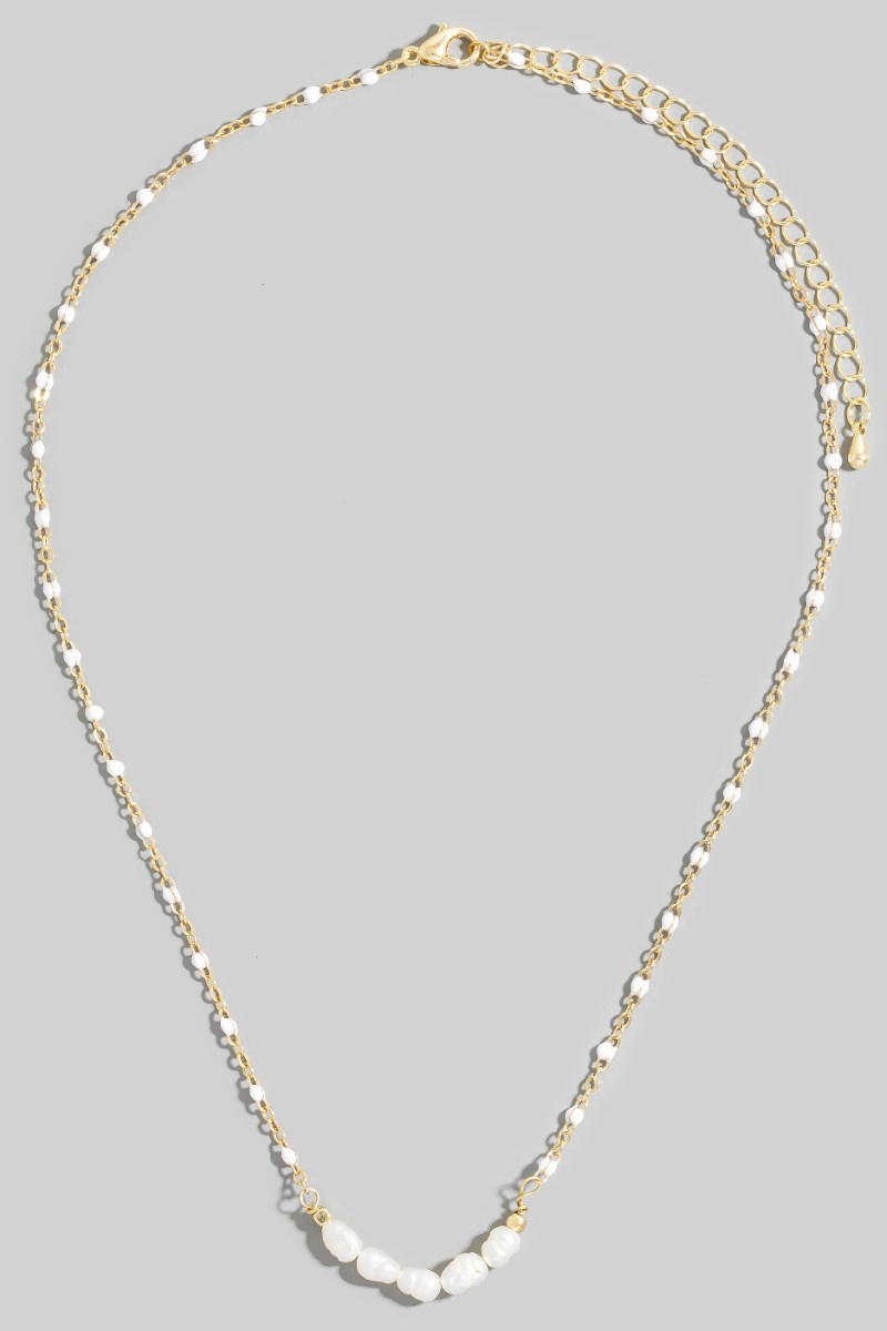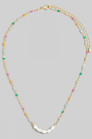 • This chain necklace brings a luxurious enamel and pearly beaded row dainty style. Experience refined sophistication with this understated yet stylish piece.