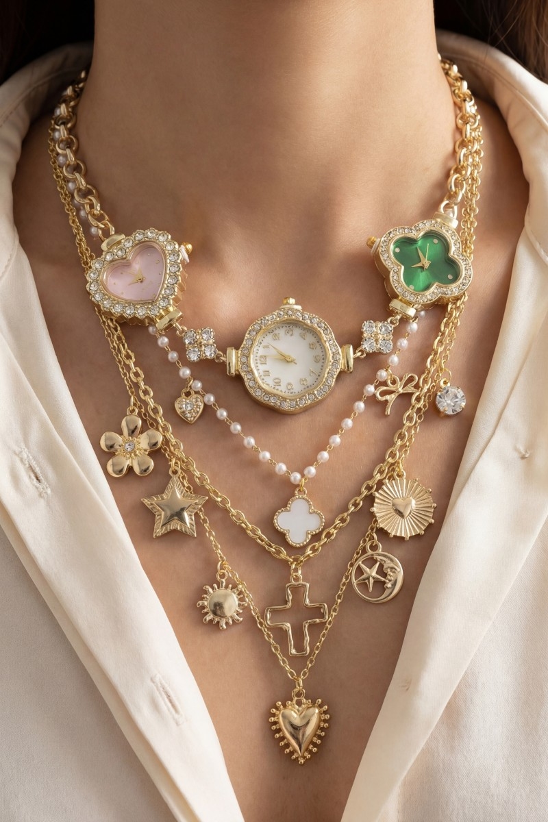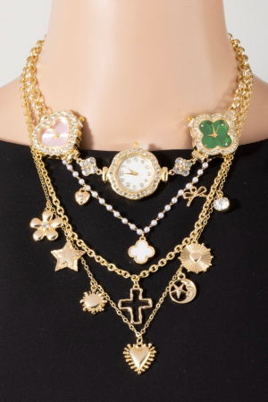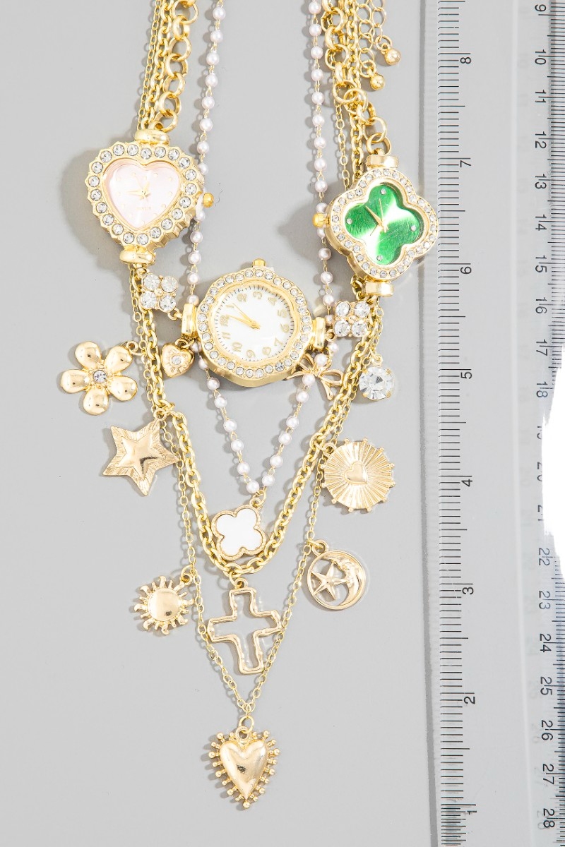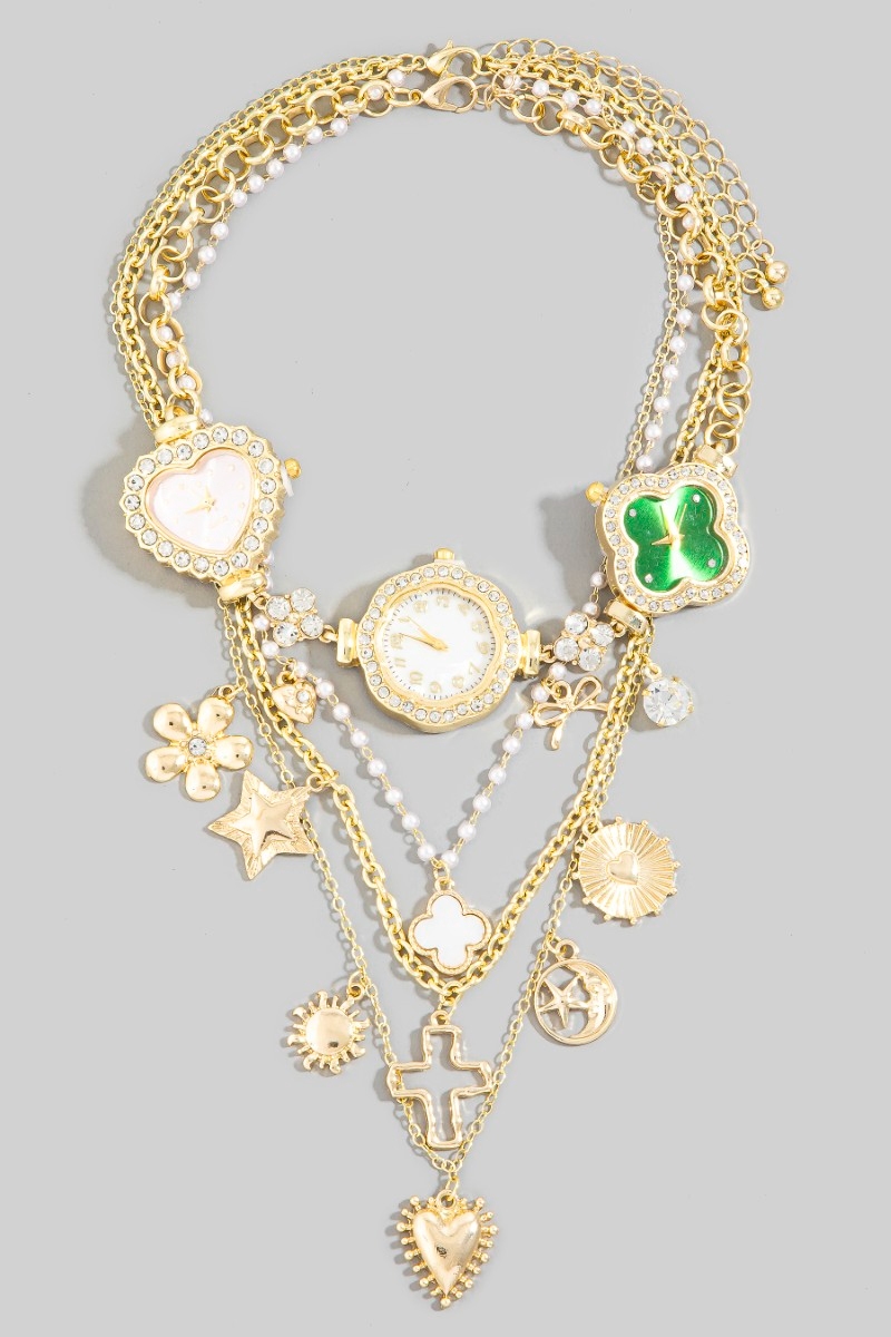 - This layered necklace brings a luxurious assorted layered charms & watches statement necklace style. Experience refined sophistication with this understated yet stylish piece.