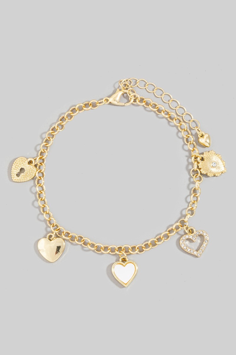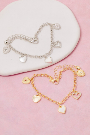 - This chain bracelet brings a stunning assorted heart charms style. Witness the perfect fusion of style and functionality as this chain bracelet effortlessly complements your lifestyle.