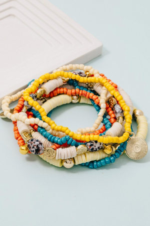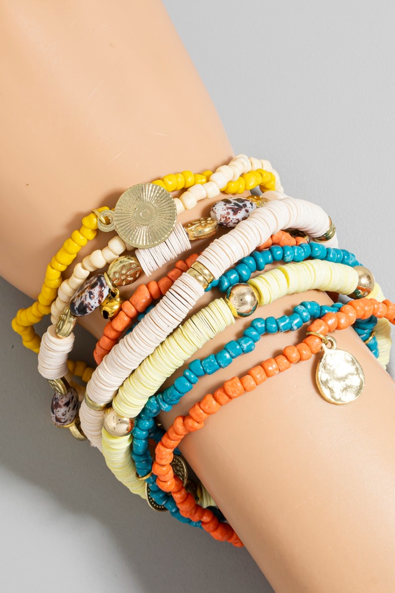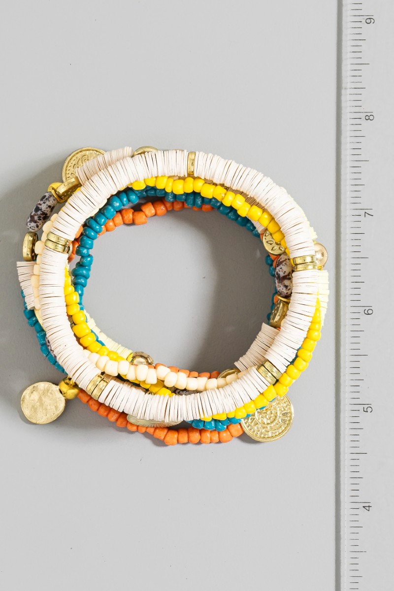 - This bracelet displays a fashionable stone and coin charms mixed beaded set style. Redefine your look effortlessly with this standout, on-trend piece.