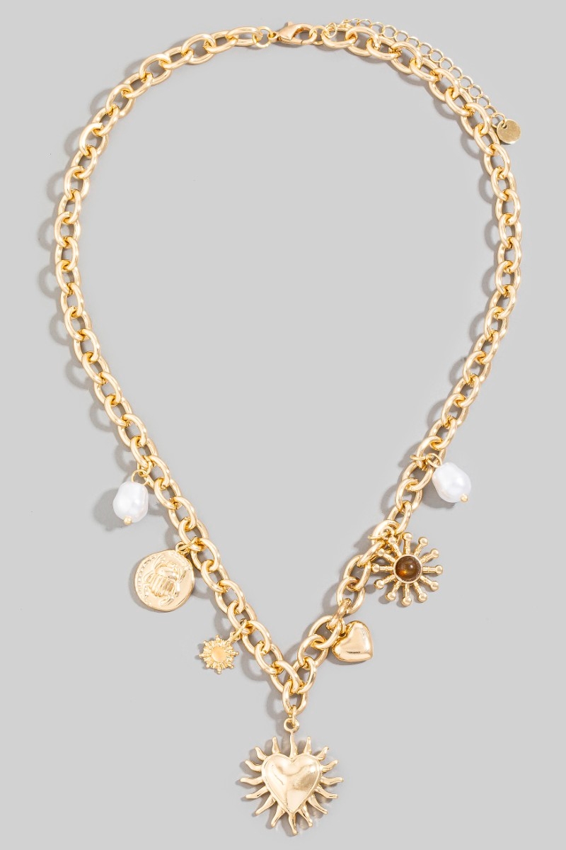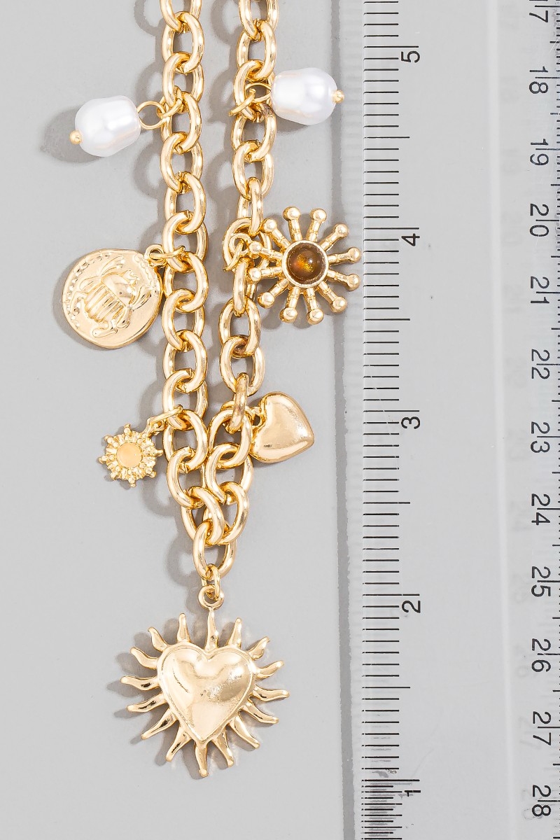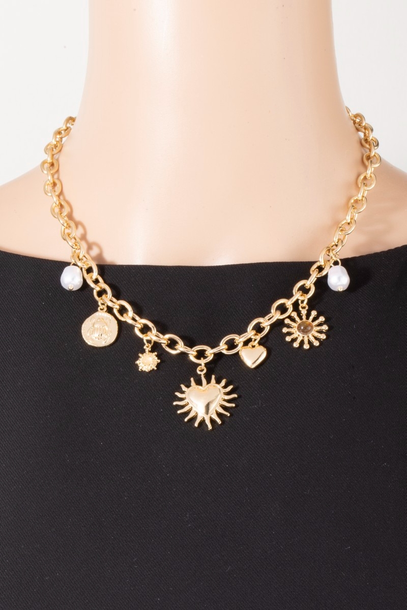 - This chain necklace displays a fashionable mixed heart and pearl charms style. Savor the craftsmanship that goes beyond the ordinary, as this chain necklace effortlessly captivates attention.