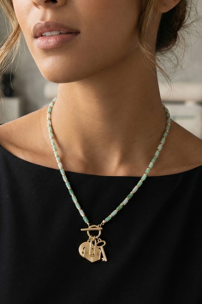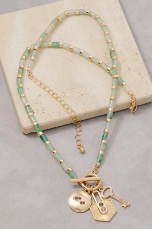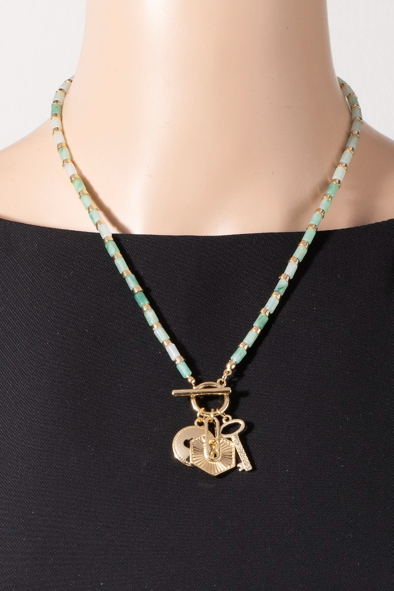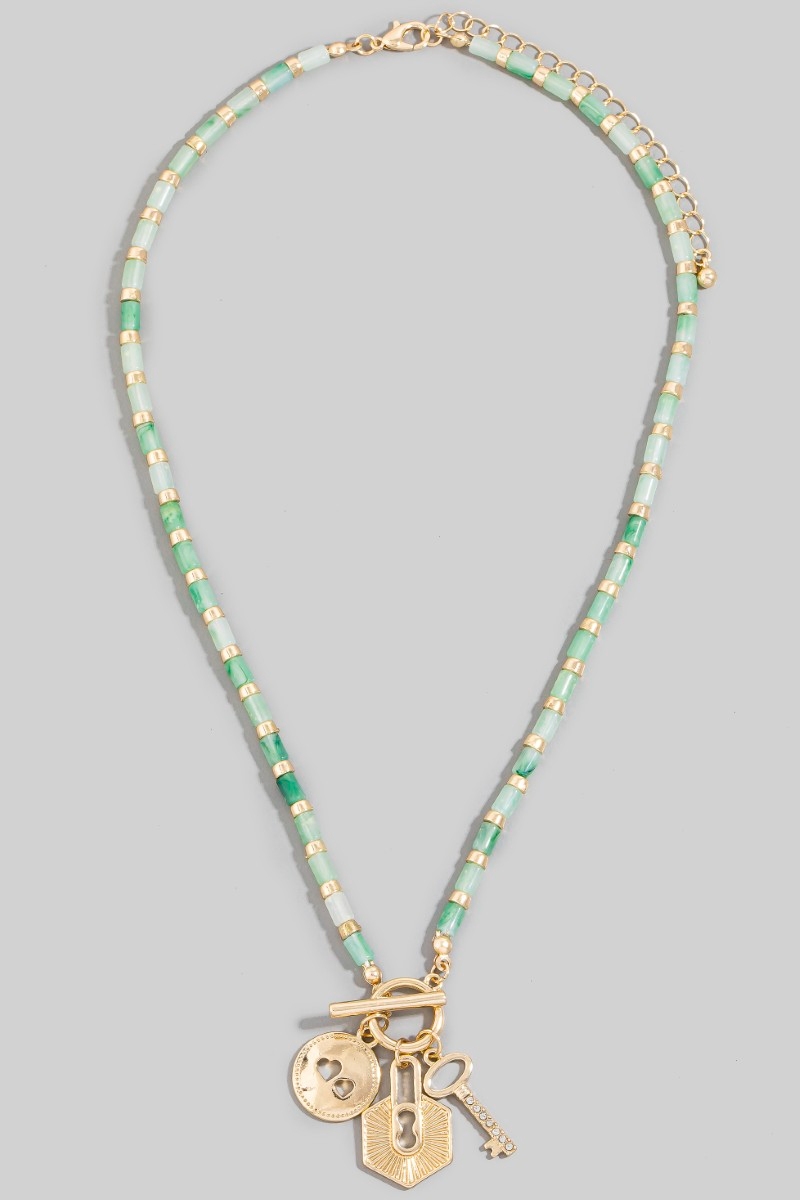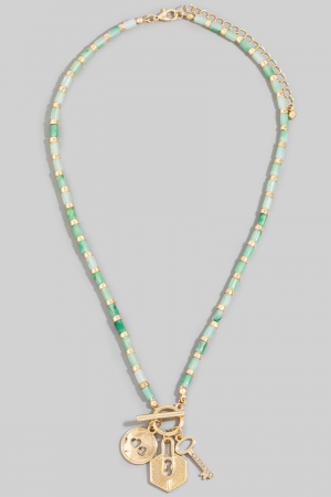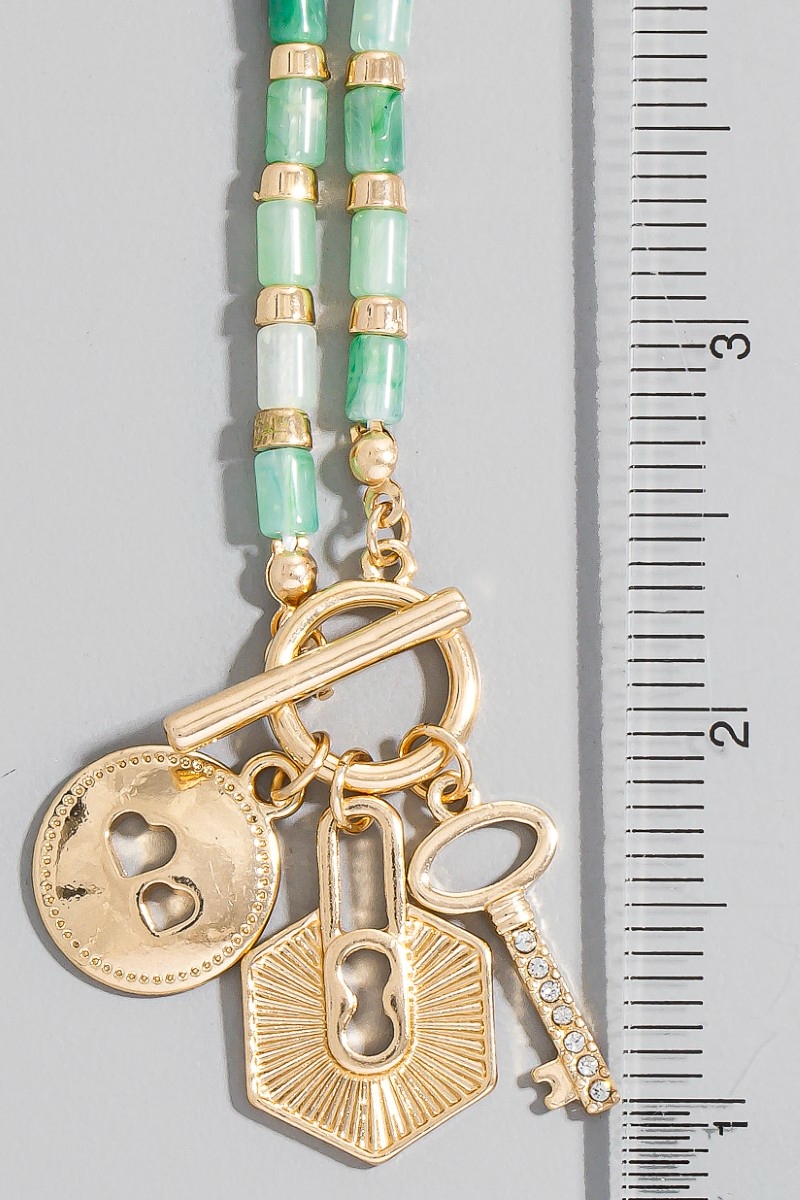 • This necklace introduces a stunning heart coin lock and key charms toggle beaded style. Immerse yourself in the details of design, as this necklace effortlessly becomes a conversation starter.