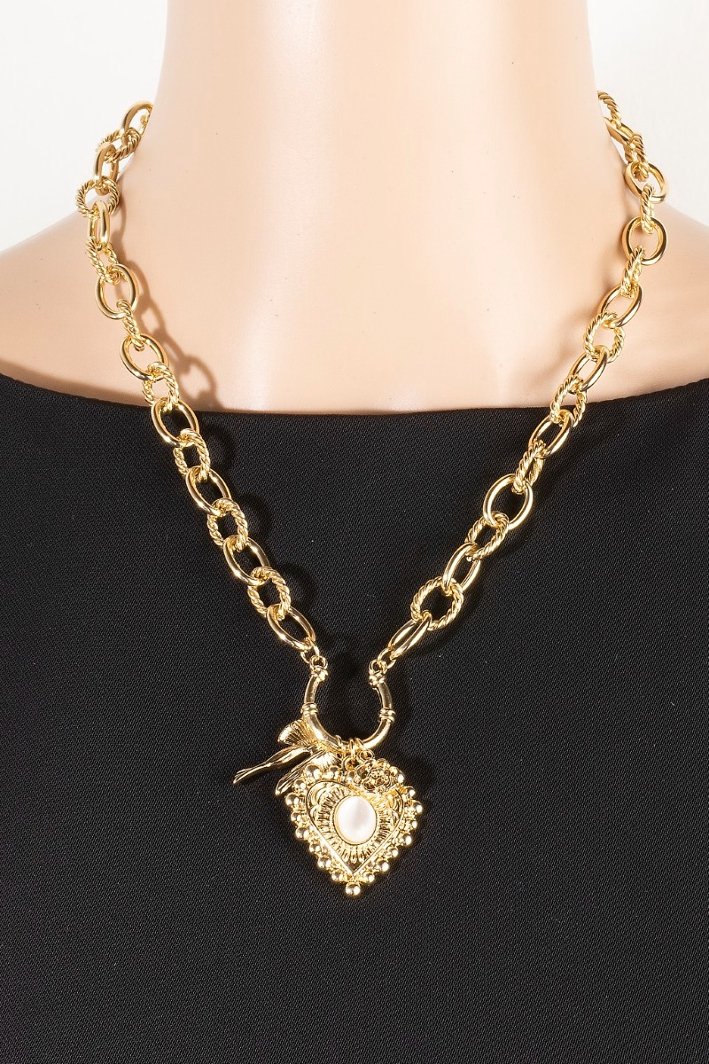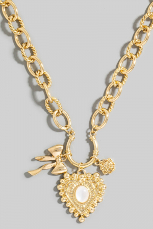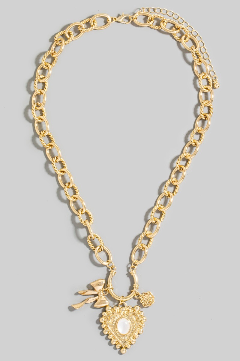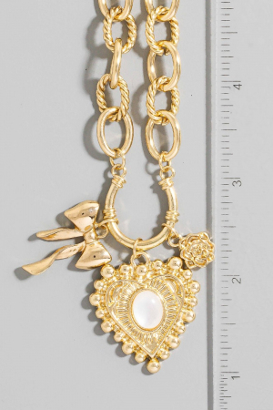 • This chain necklace brings a unique heart and ribbon bow pendants style. Revel in the intricate design that effortlessly distinguishes this chain necklace, making it a statement piece.