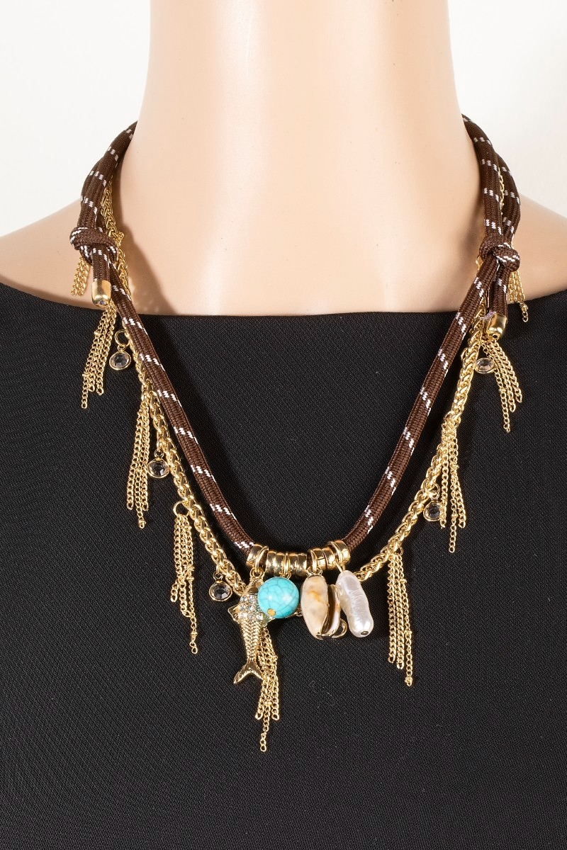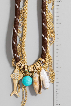 • This layered necklace displays a vibrant sea life charms chain and cord style. Redefine your look effortlessly with this standout, on-trend piece.
