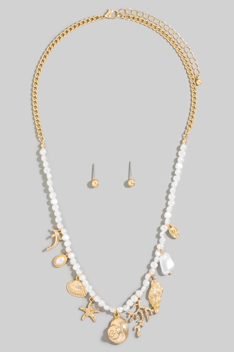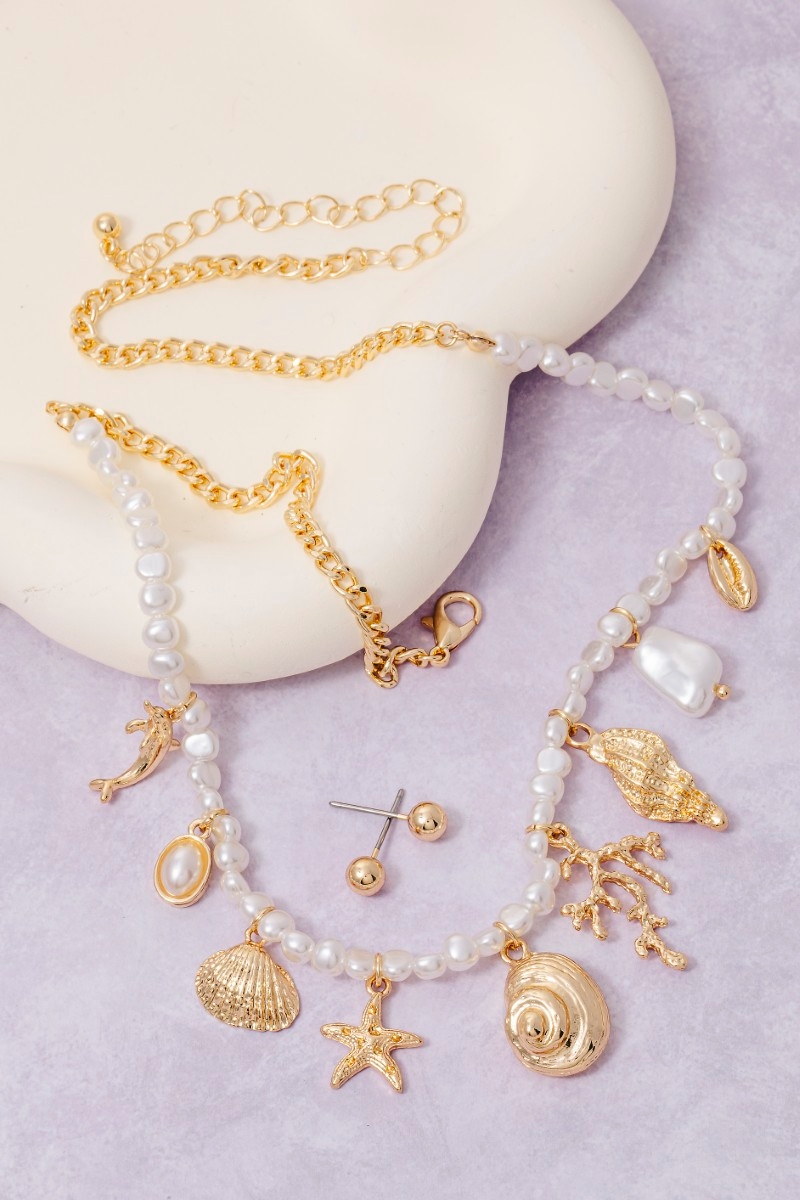 Mixed Sea Life And Pearl Charms Chain Necklace
