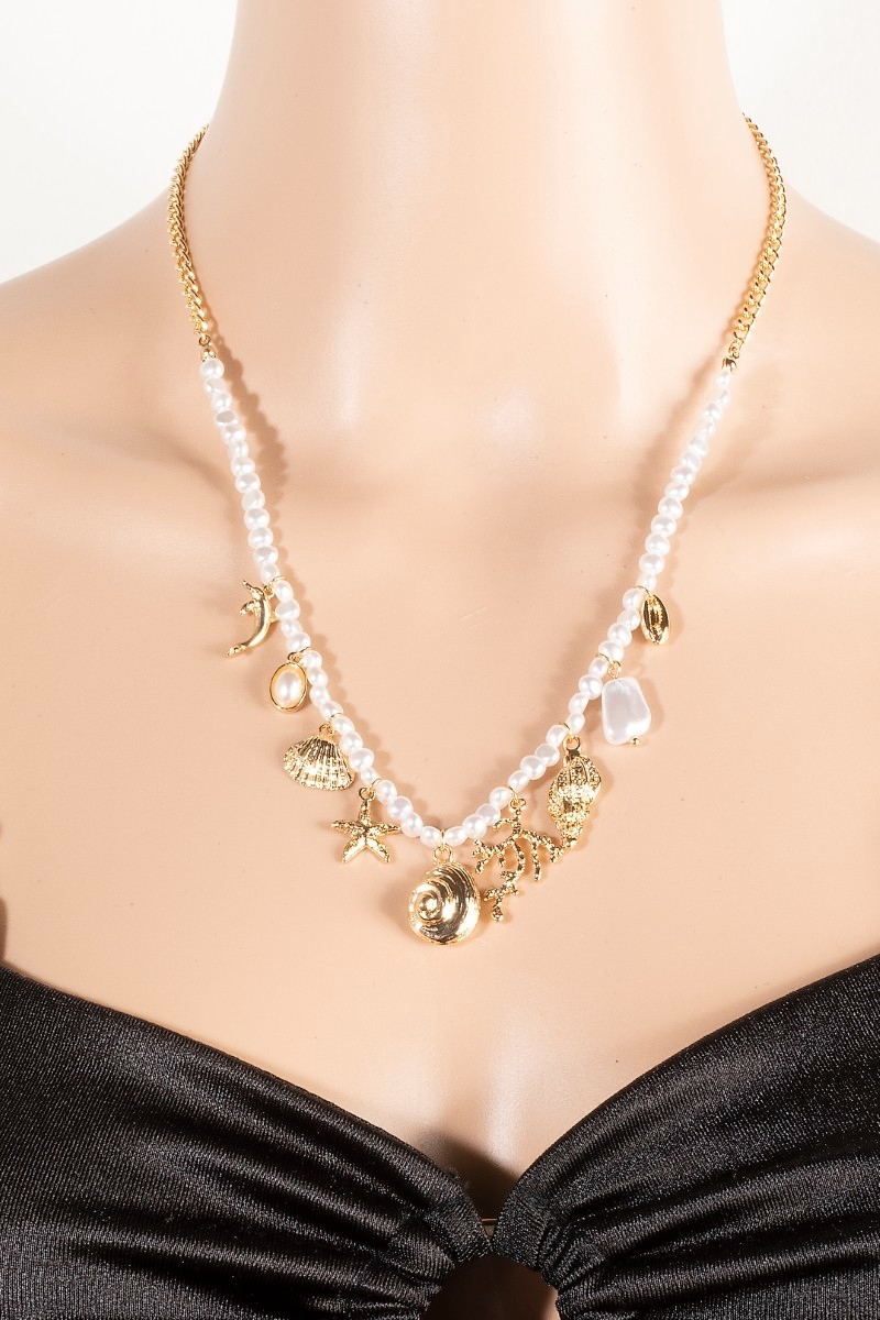 • This chain necklace displays a fashionable sea life charms pearl beaded and set style. Embark on a journey of sartorial refinement as this chain necklace effortlessly complements your fashion sense.