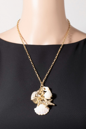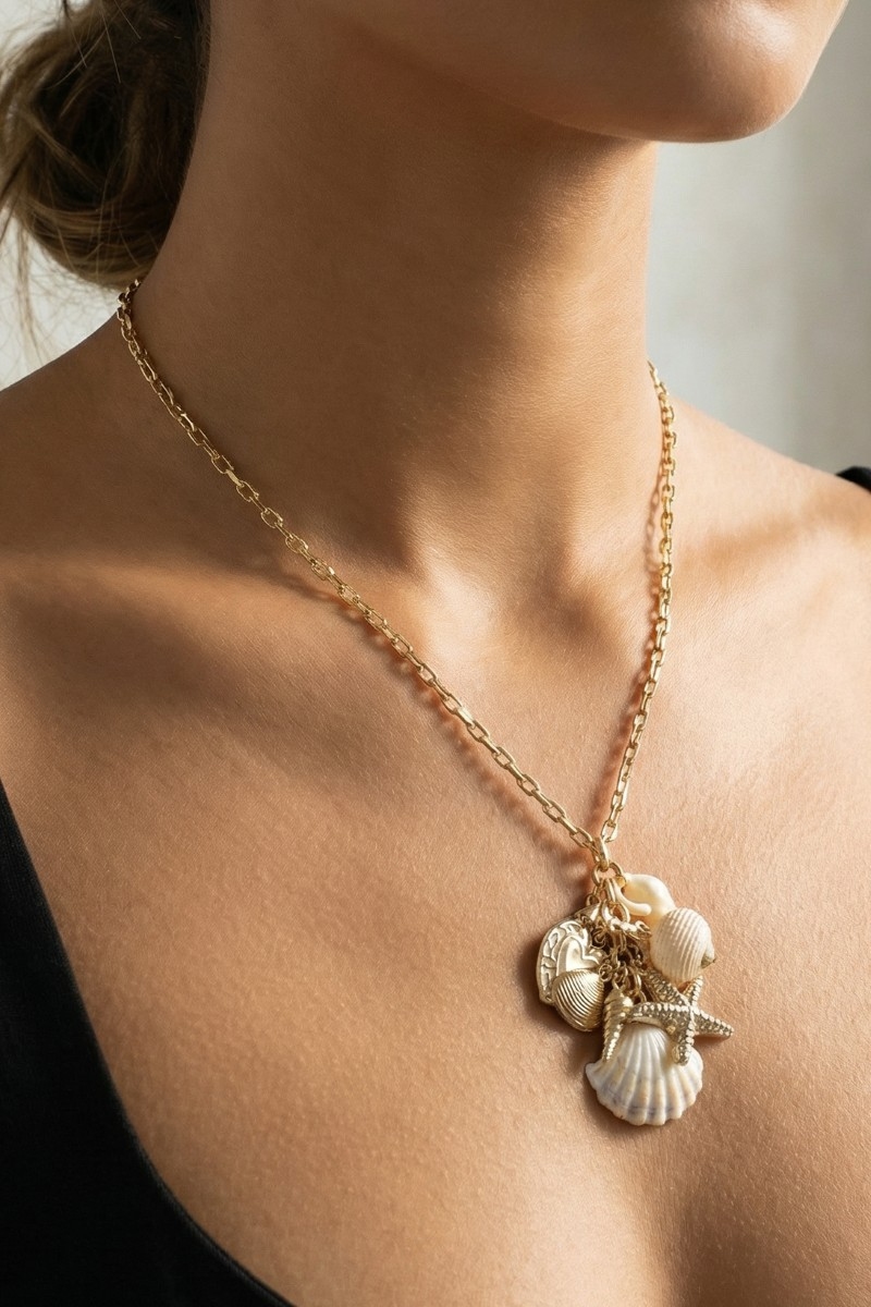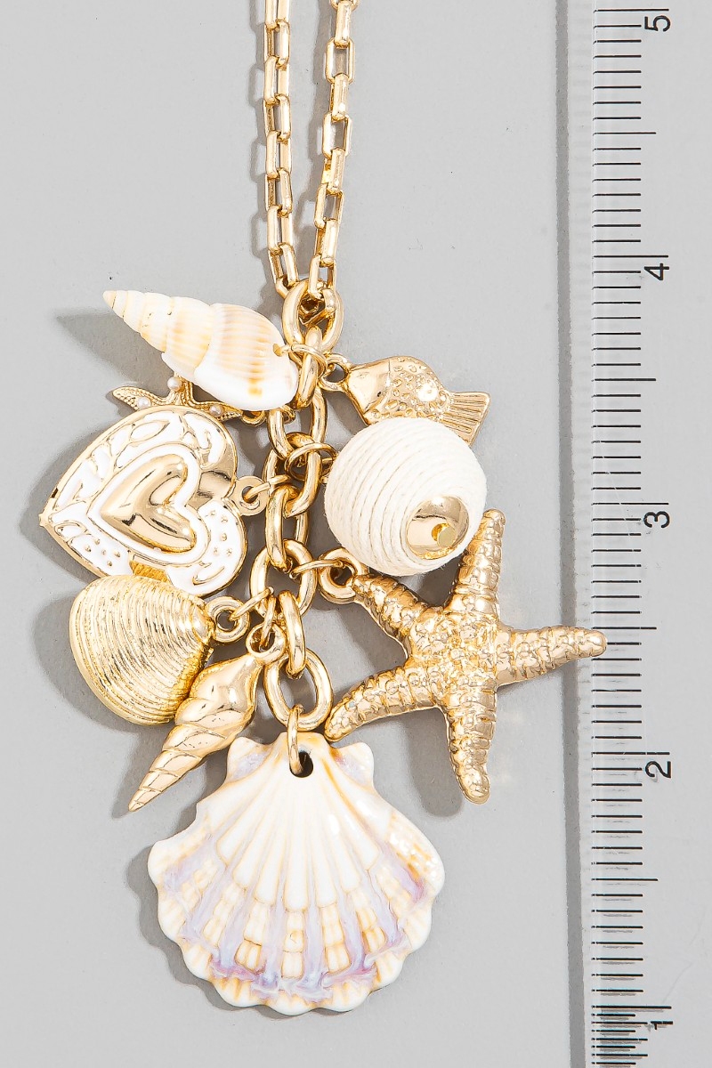 • This chain necklace displays a fashionable sea life and hearts cluster charms style. Immerse yourself in the world of understated glamour as this chain necklace effortlessly exudes timeless appeal.