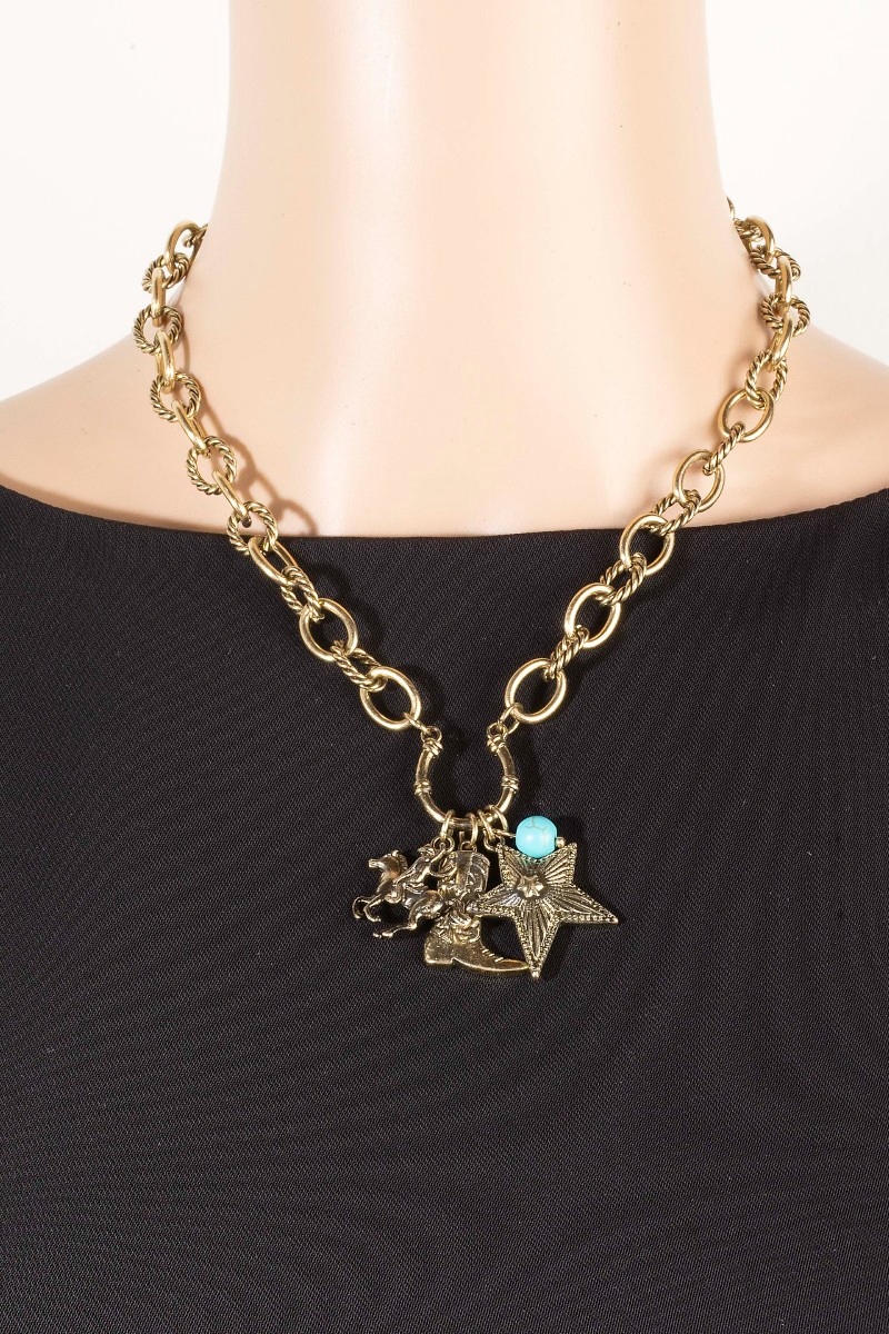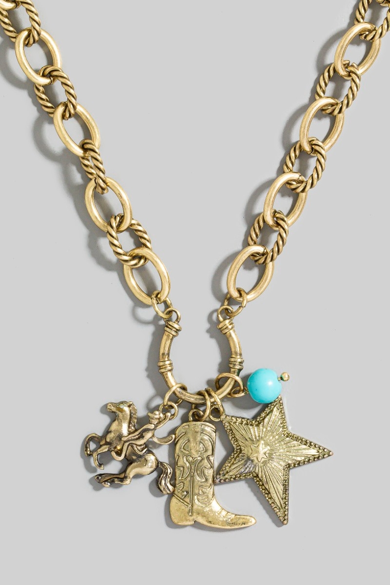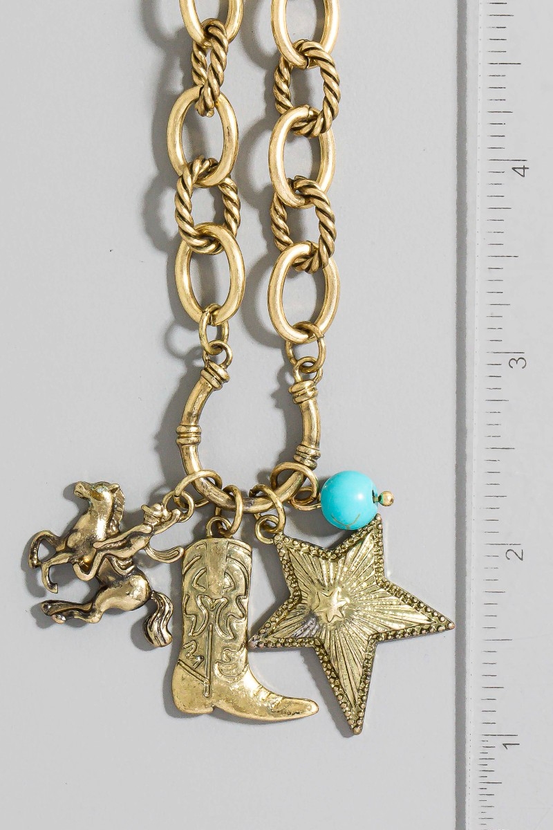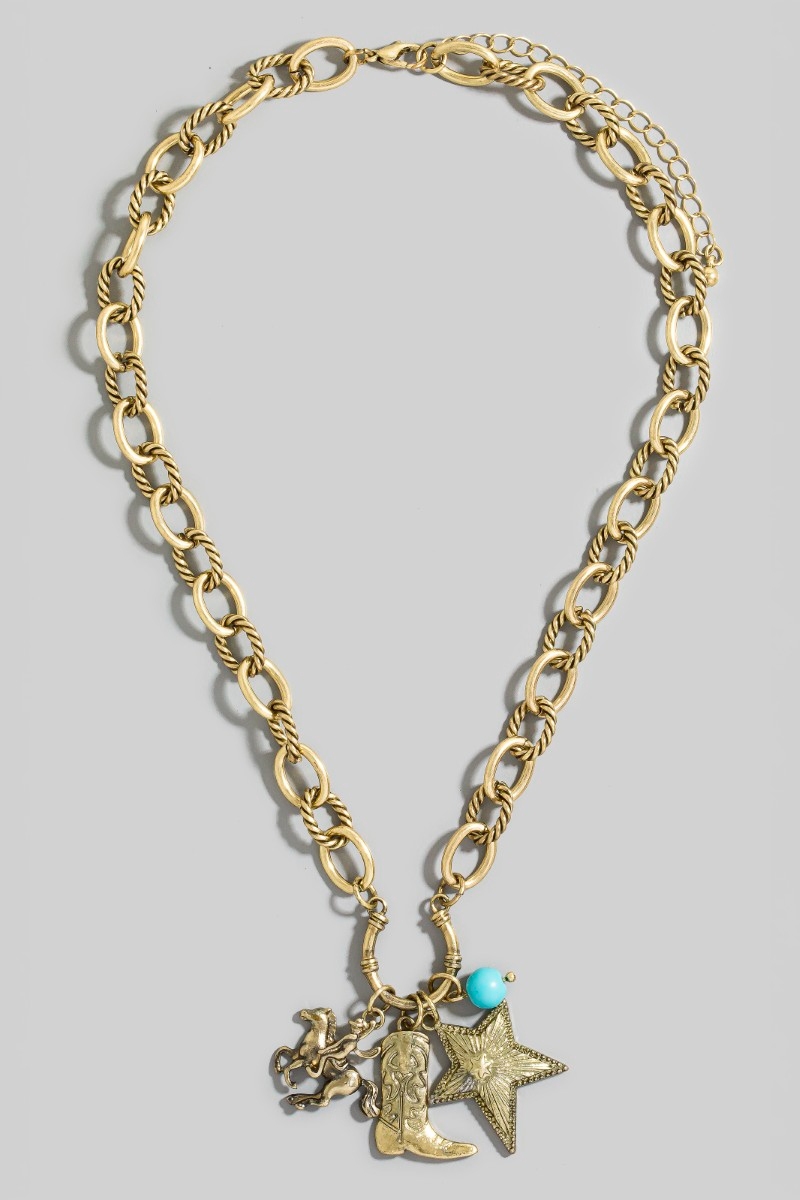 - This chain necklace features a fashionable western cowboy boot and star pendants style. Elevate your ensemble with this chain necklace that effortlessly captures the essence of refined fashion.