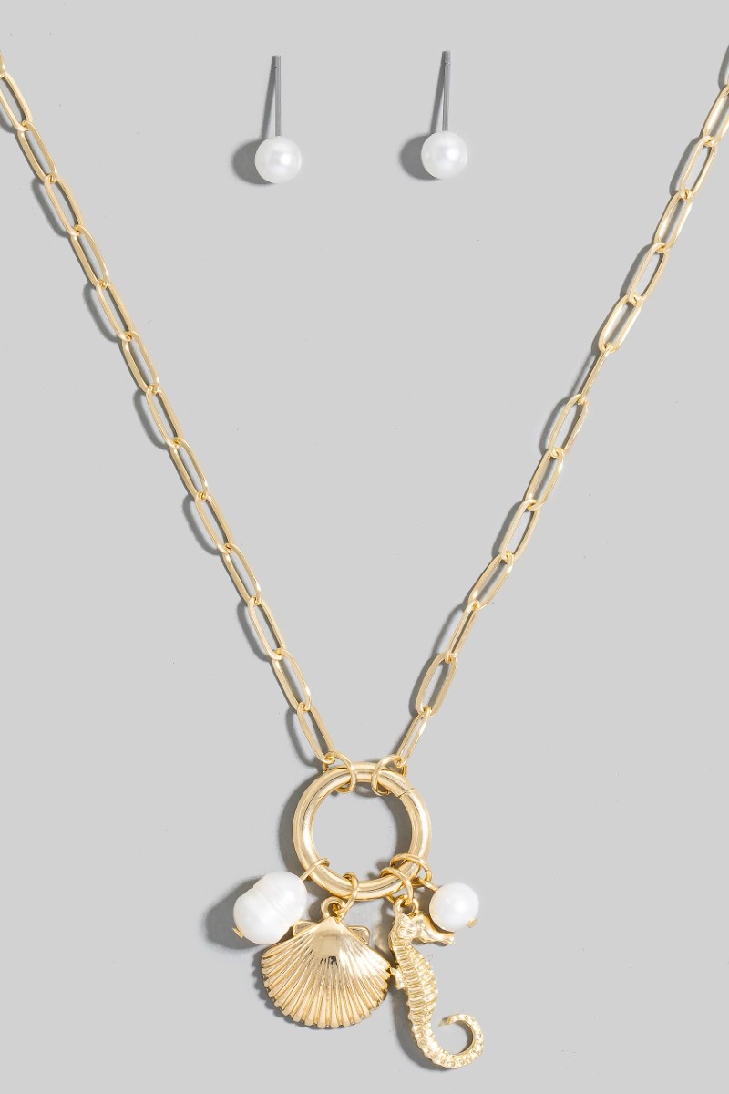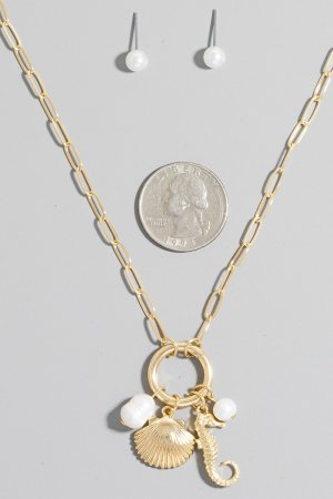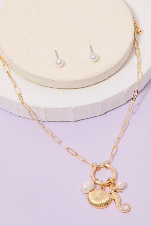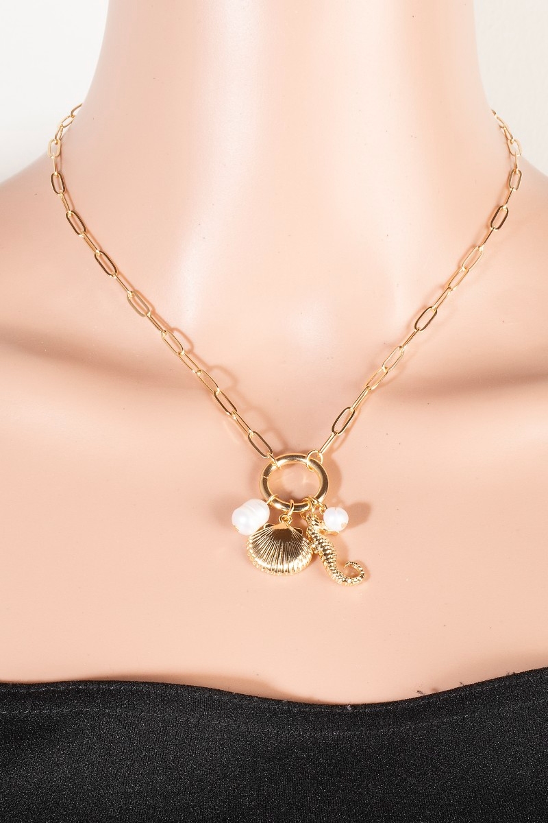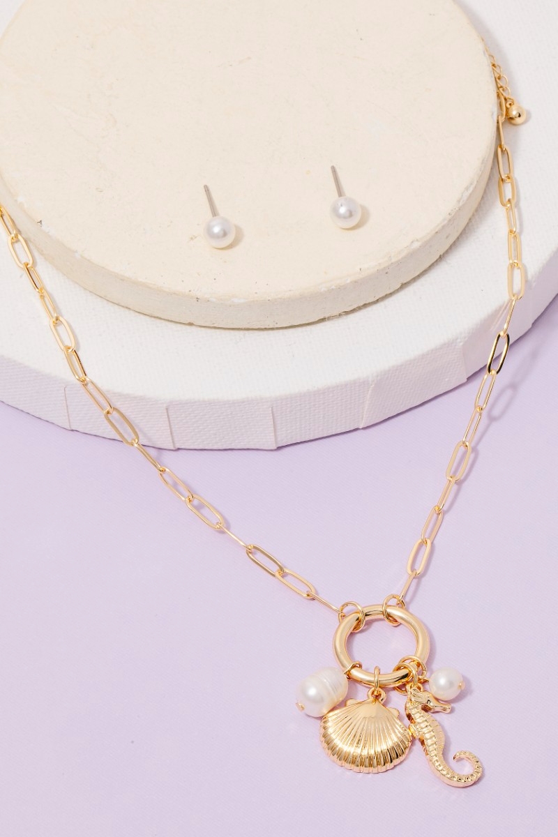 - This chain necklace brings a unique seahorse pearl and clamshell charms set style. Immerse yourself in fashion finesse with this statement chain necklace.