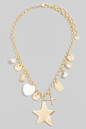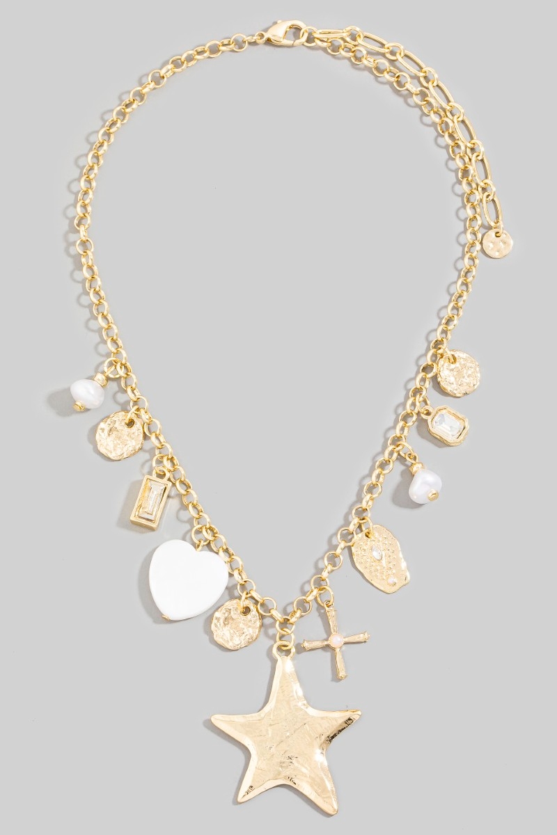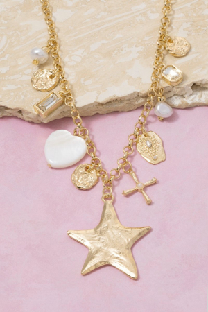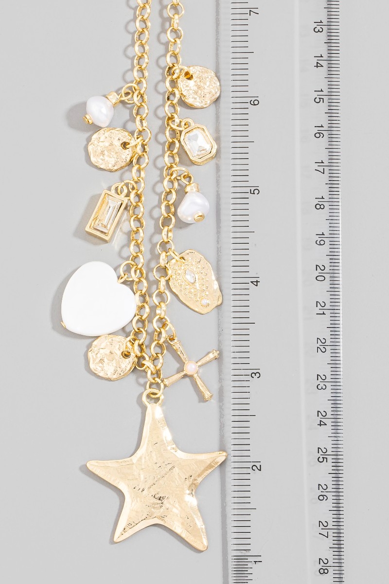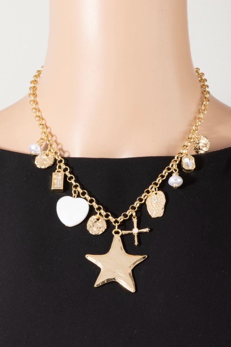 - This chain necklace displays a vibrant star hearts and cross charms style. Indulge in the allure of exquisite craftsmanship as this chain necklace effortlessly adds a touch of luxury to your attire.