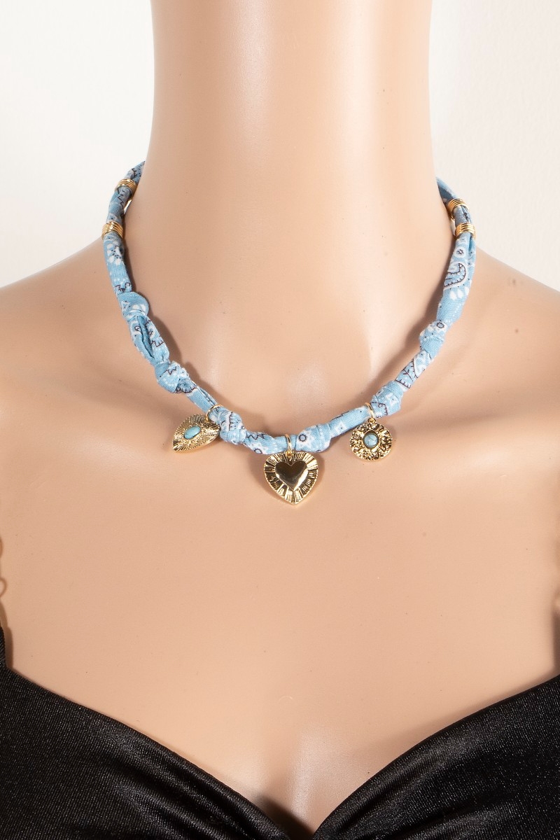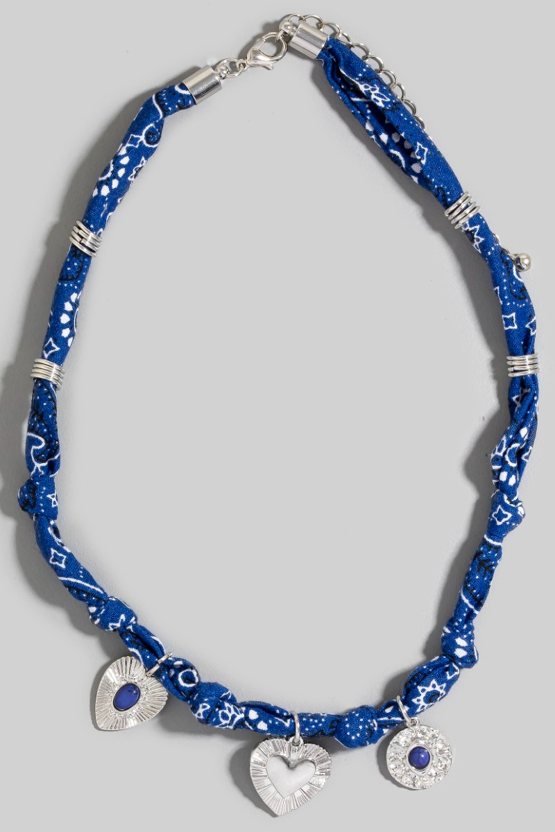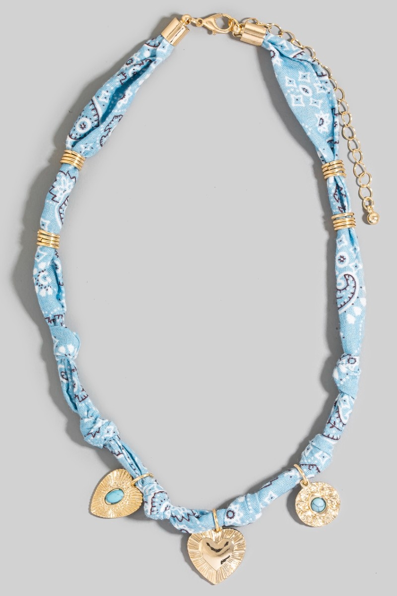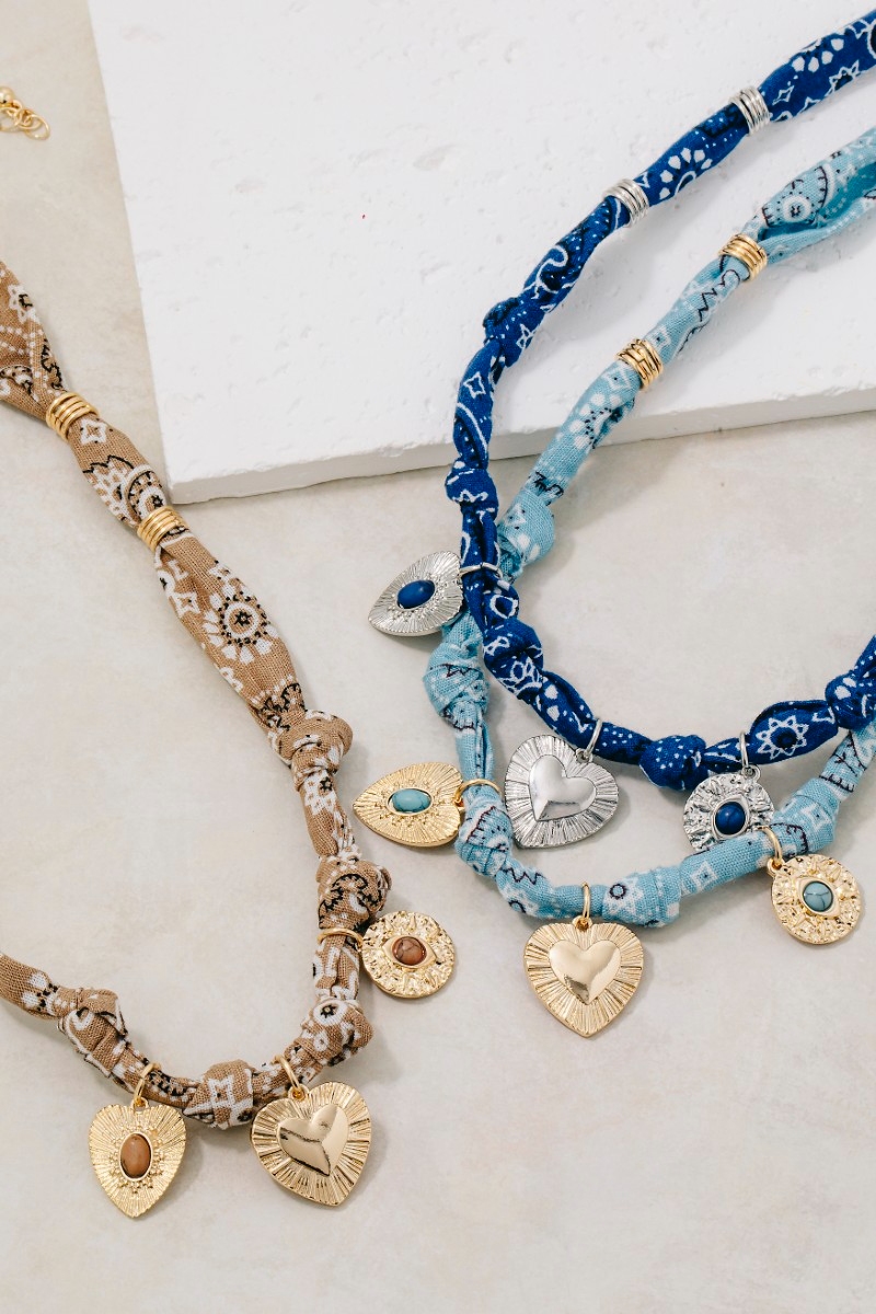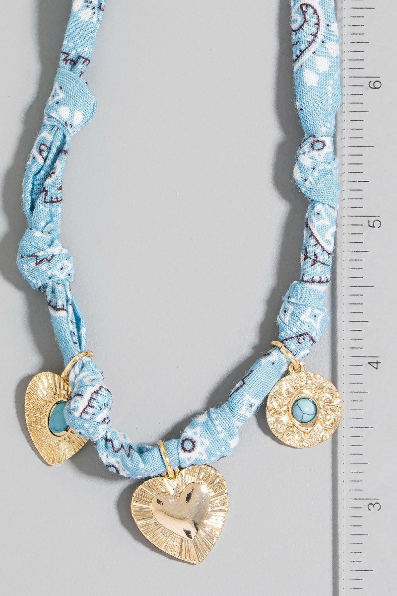 - This necklace displays a fashionable stone set heart and coin charms paisley bandana knotted style. Elevate your ensemble with this chic, timeless necklace.