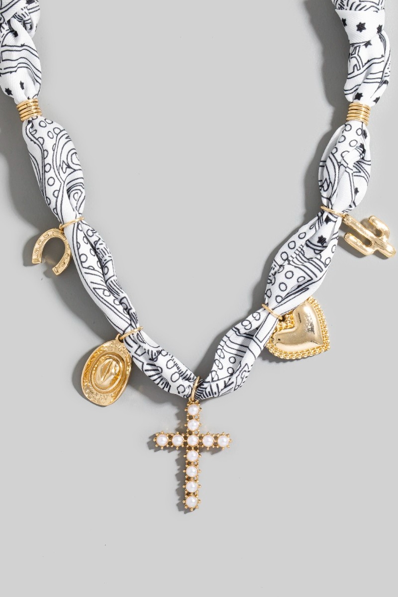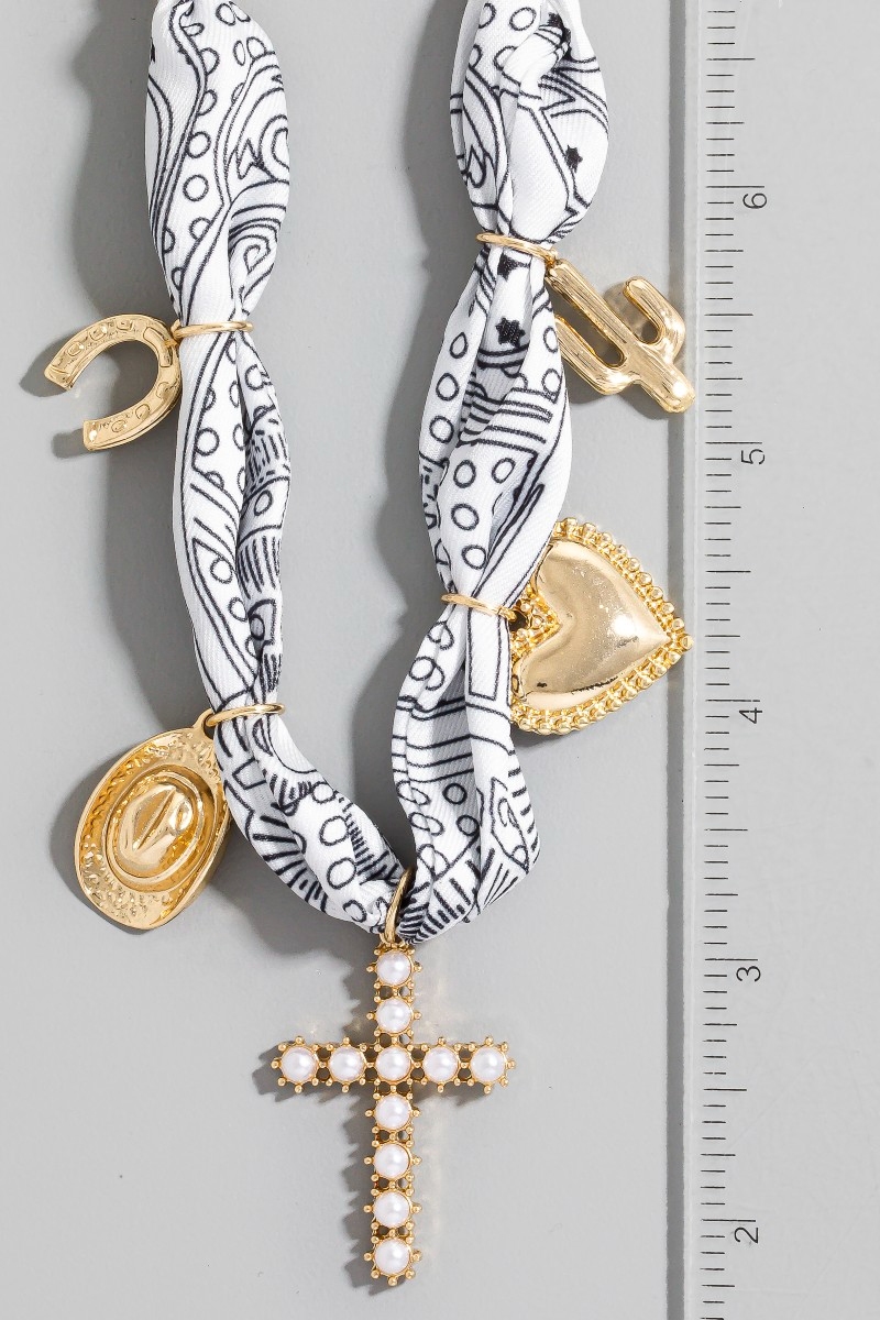 • This necklace showcases a unique western heart and pearl cross charms bandana style. Embark on a journey of sartorial refinement as this necklace effortlessly complements your fashion sense.