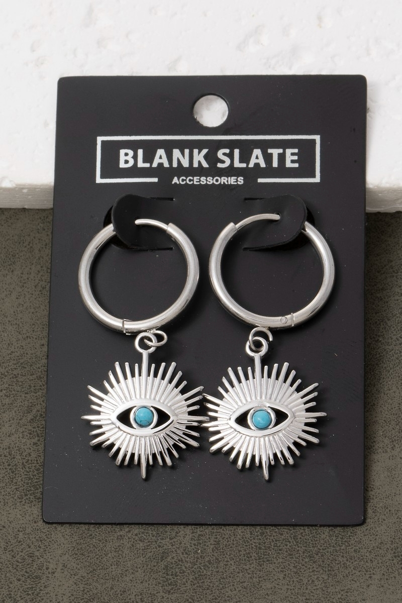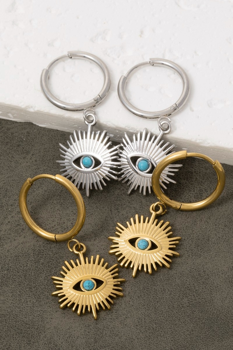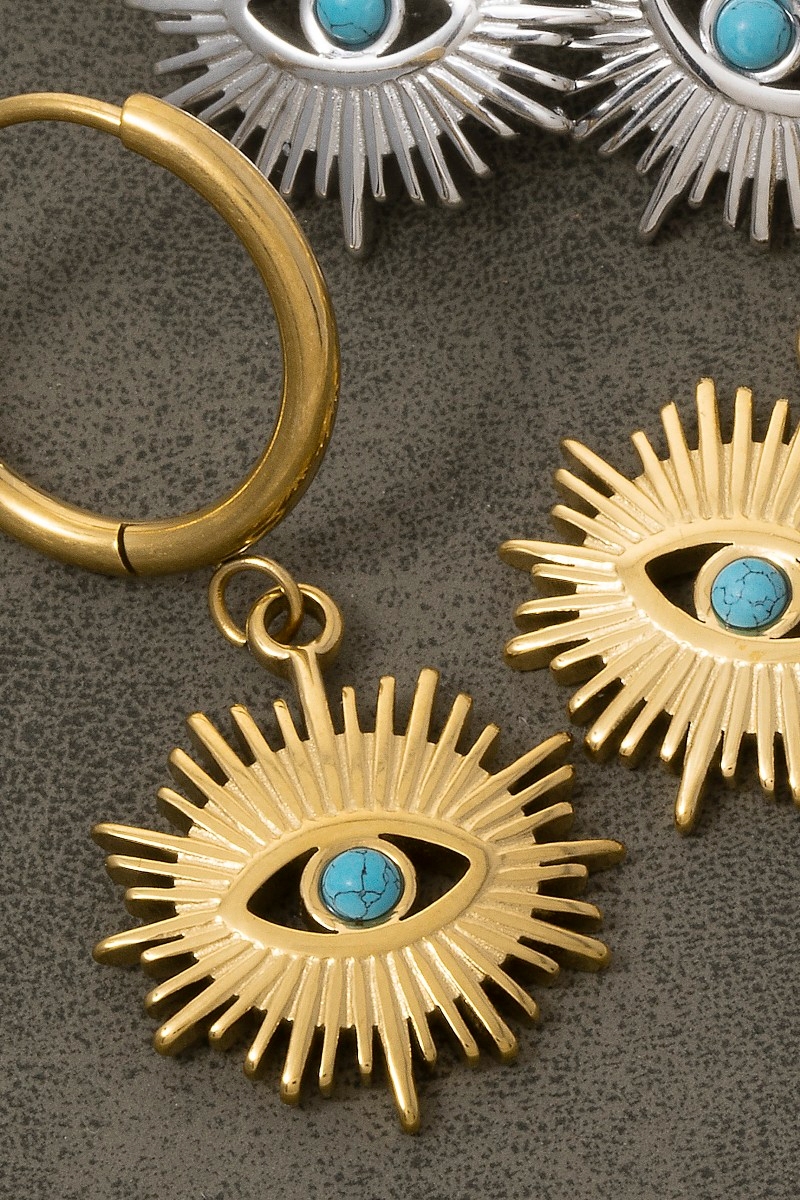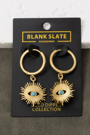• This pair of drop earrings brings a unique gold dipped evil eye sun style. Experience a subtle blend of modernity and classic charm as this pair of drop earrings effortlessly adorns your ensemble.