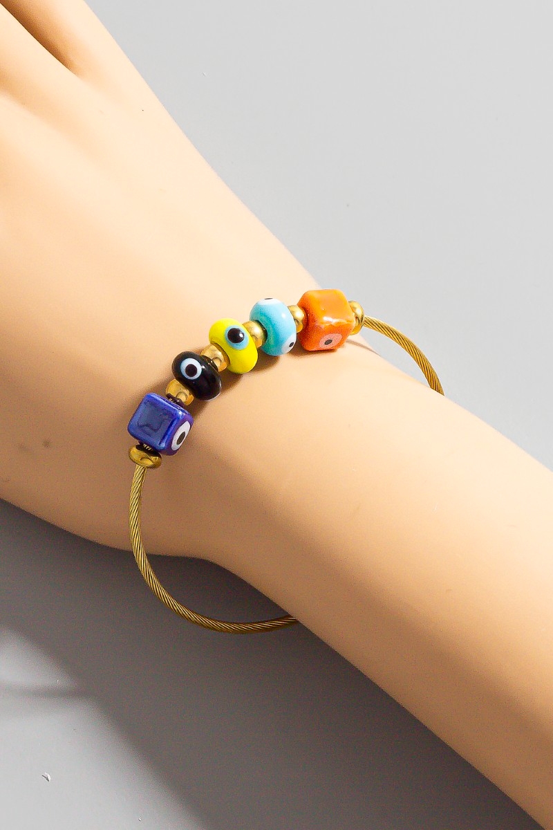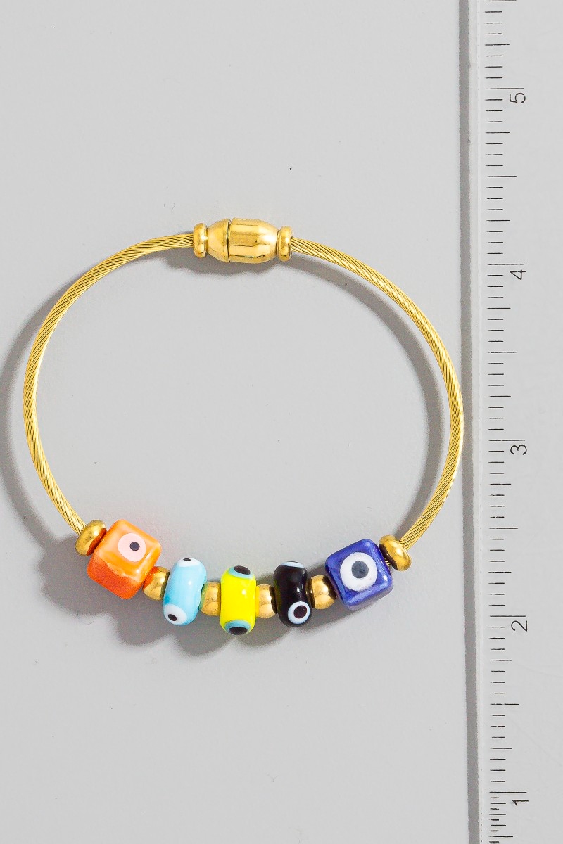 • This bangle bracelet showcases a timeless stainless steel colorful evil eye blocks bracelet style. Elevate your ensemble with this bangle bracelet that effortlessly captures the essence of refined fashion.