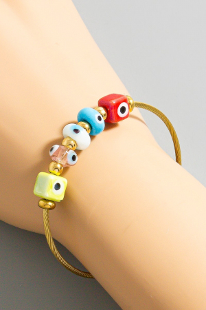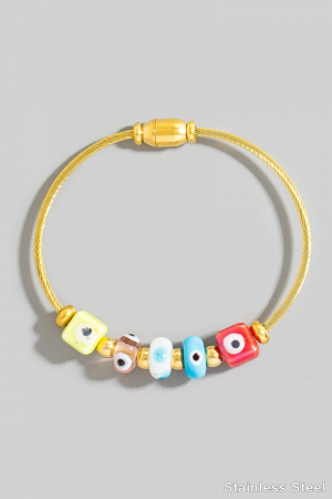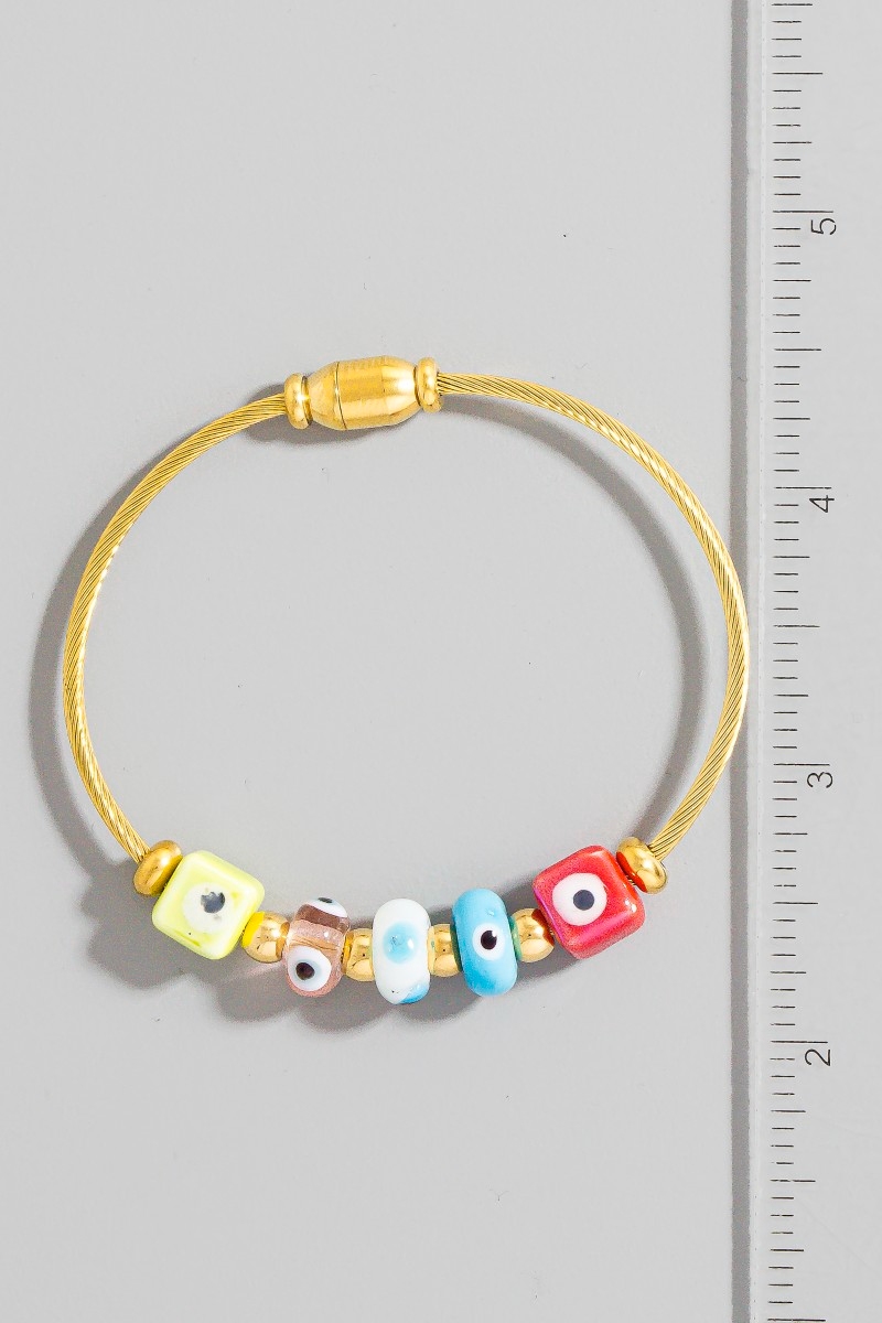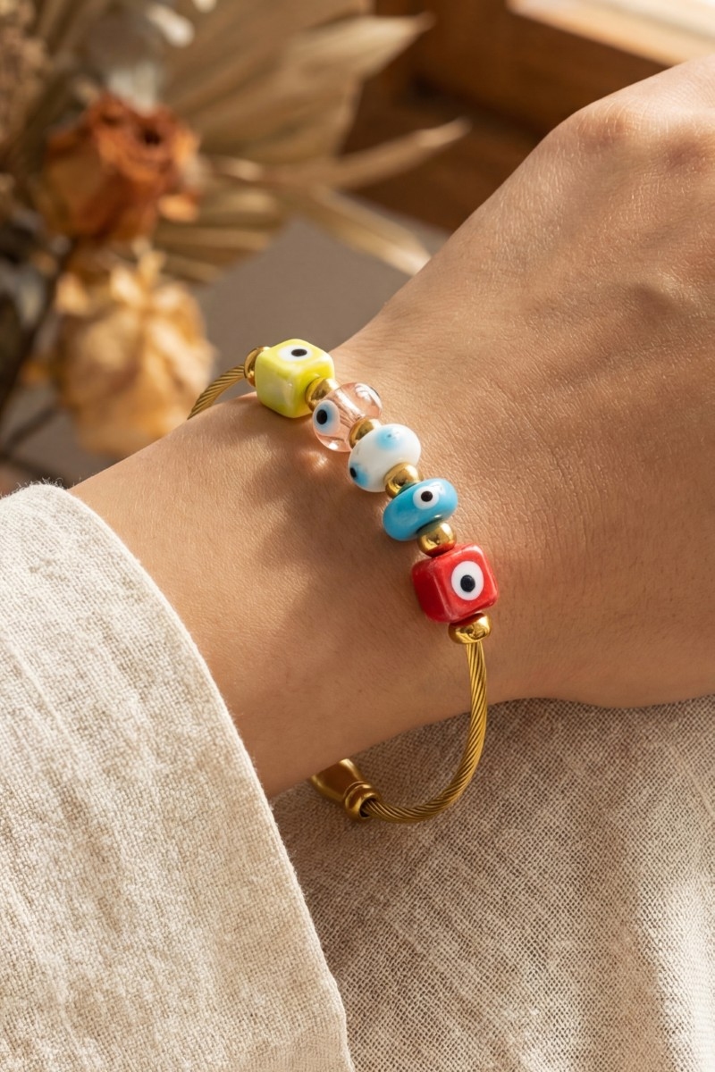 - This bangle bracelet adds a modern stainless steel cord assorted evil eye blocks bracelet style. Revel in the intricate design that effortlessly distinguishes this bangle bracelet, making it a statement piece.