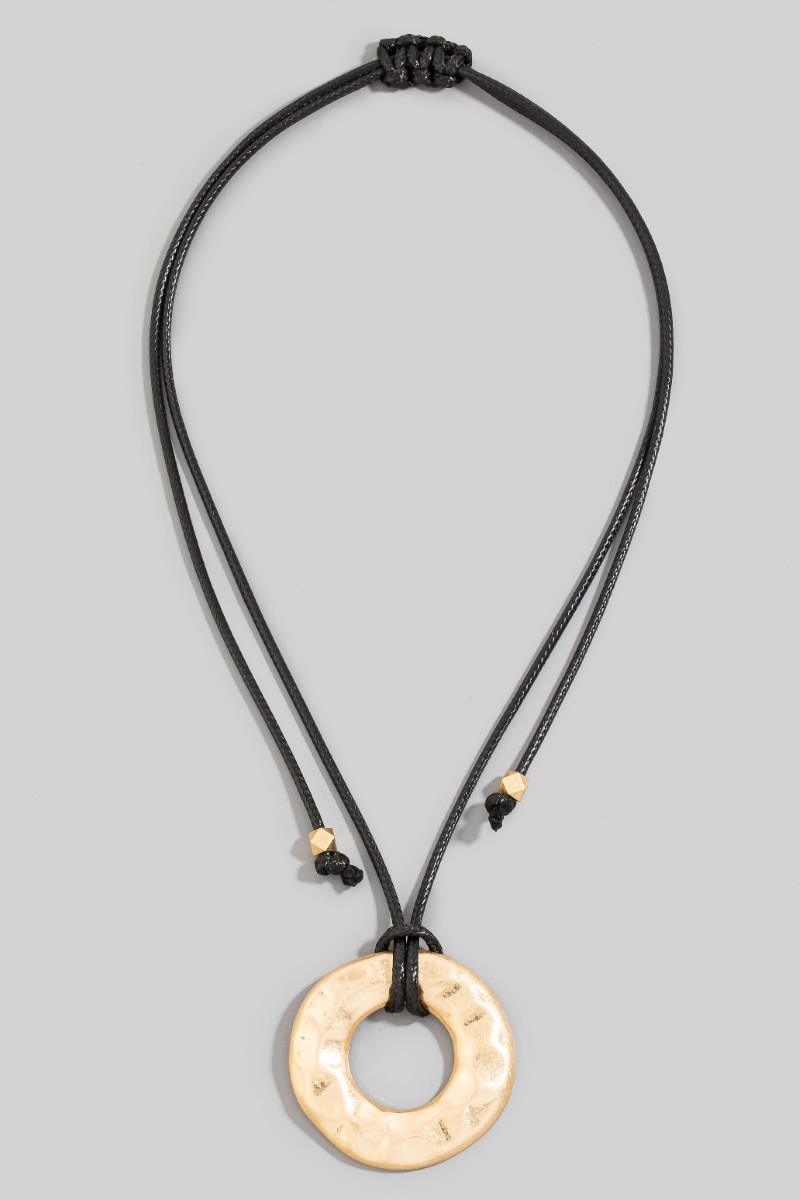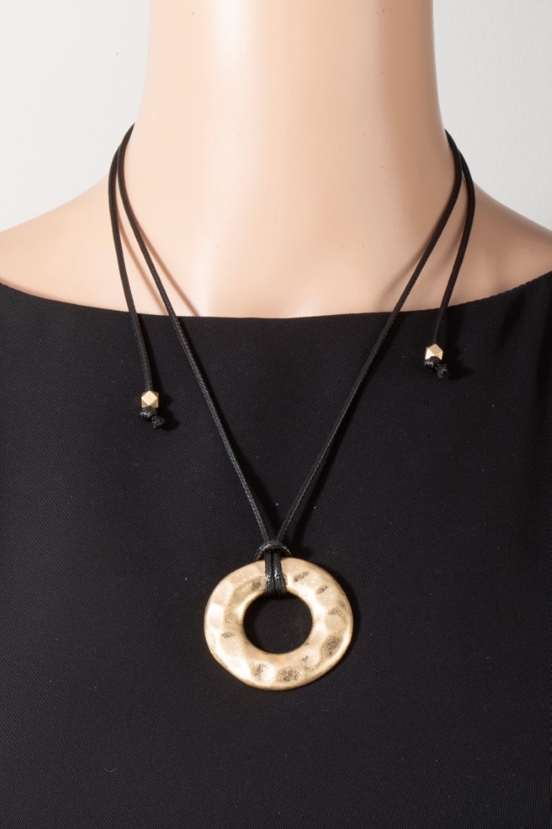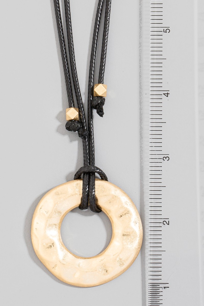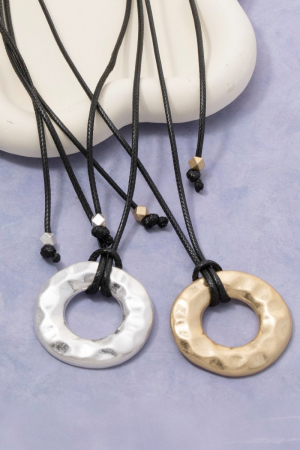 - This pendant necklace showcases a timeless adjustable cord hammered circle ring style. Step into a world of refined taste as this pendant necklace effortlessly refines the details of your outfit.