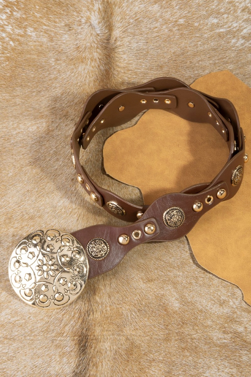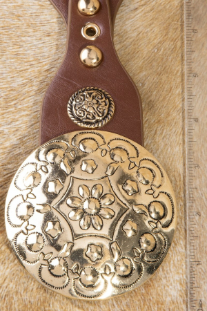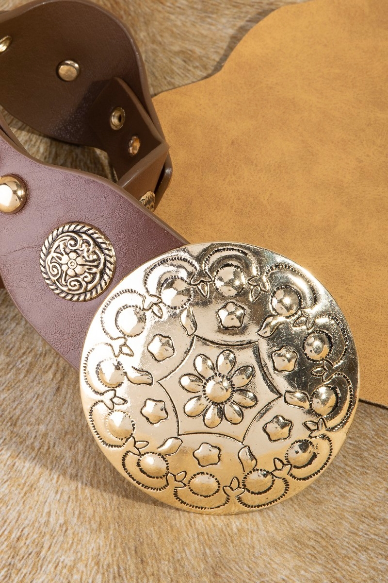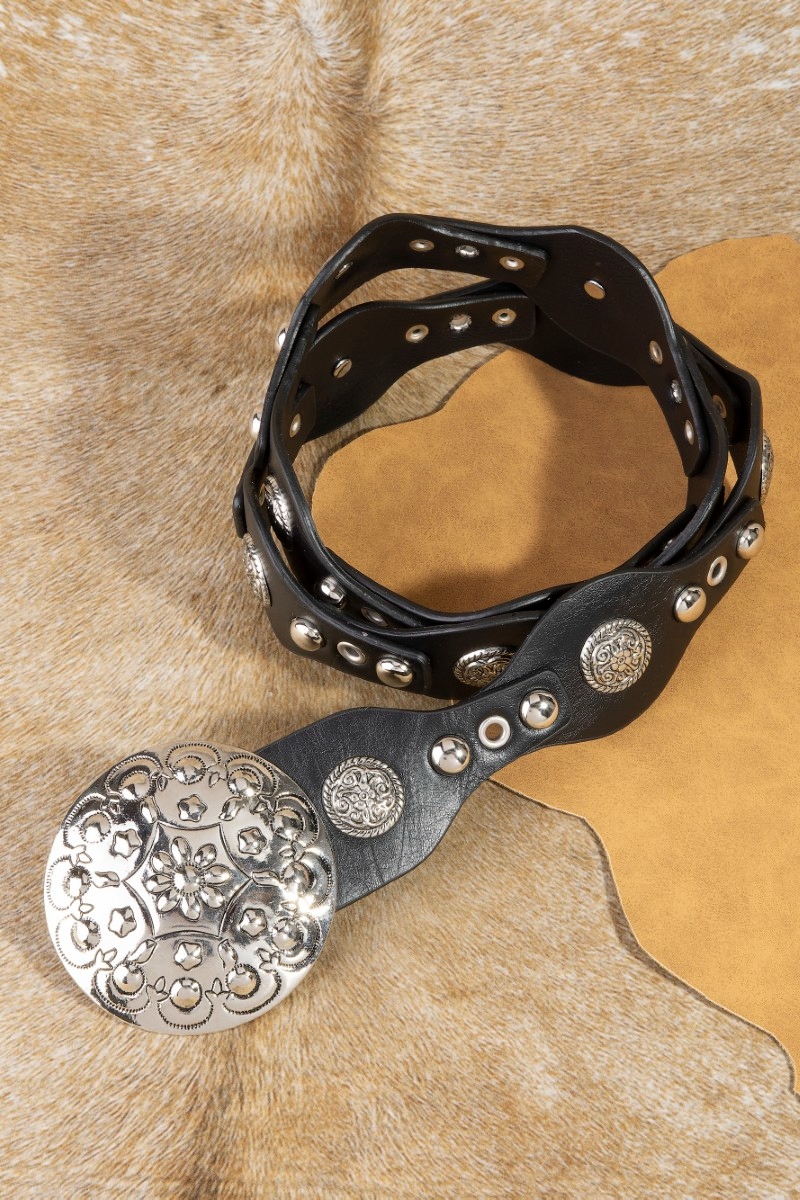 - This leather belt introduces a stunning ornate large concho disc buckle style. Experience a burst of creativity in accessorizing as this piece effortlessly sets the tone for your unique style.