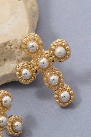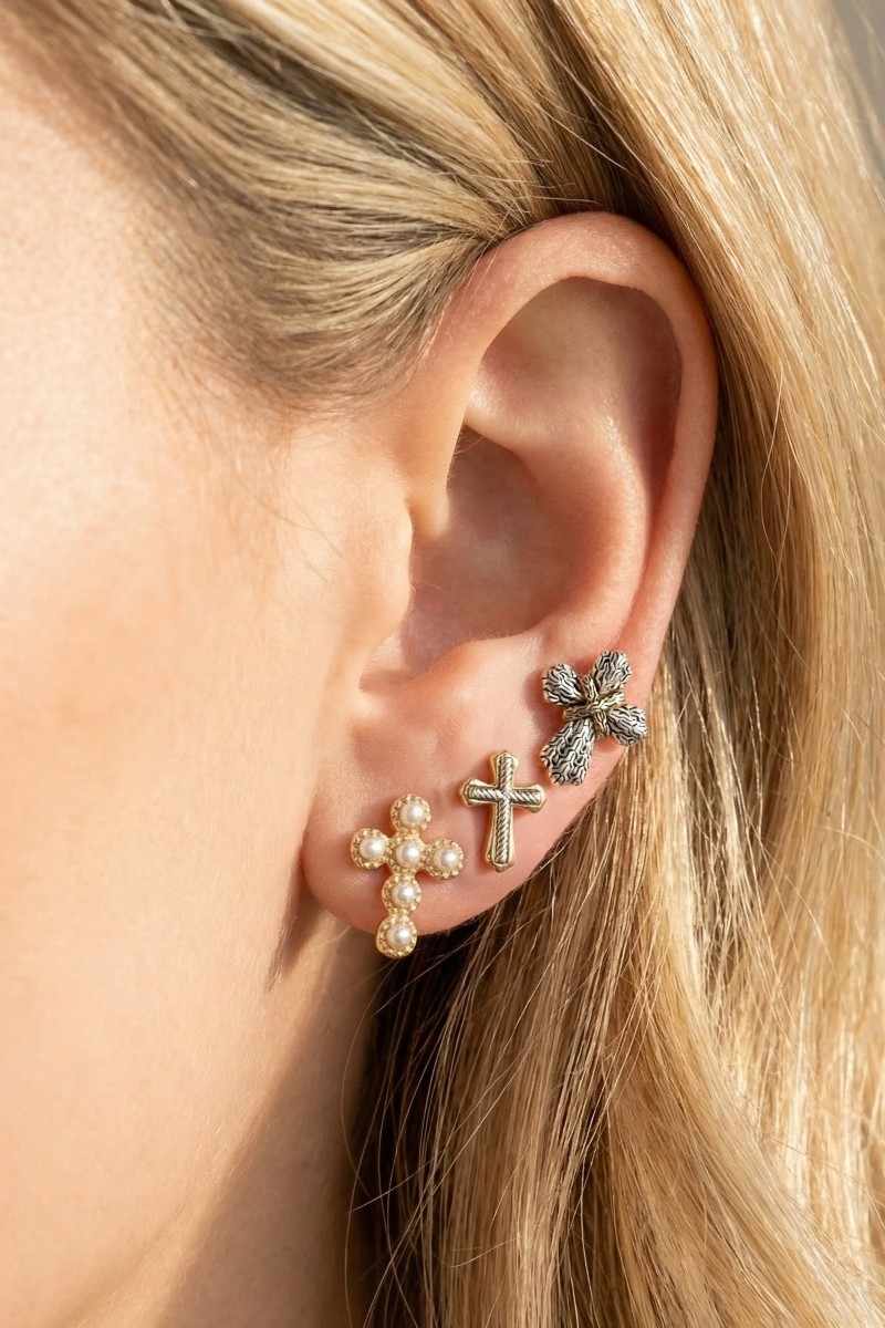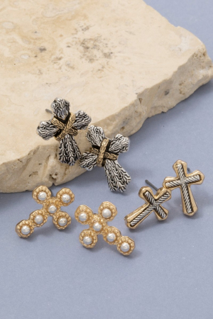 - This pair of stud earrings features a fashionable mixed intricate cross set style. Indulge in the artistry of accessorizing with this unique piece.