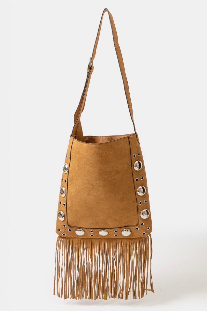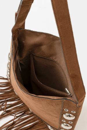 - This tote bag brings a stunning faux suede grommet accent fringe style. Embark on a journey of sartorial refinement as this tote bag effortlessly complements your fashion sense.