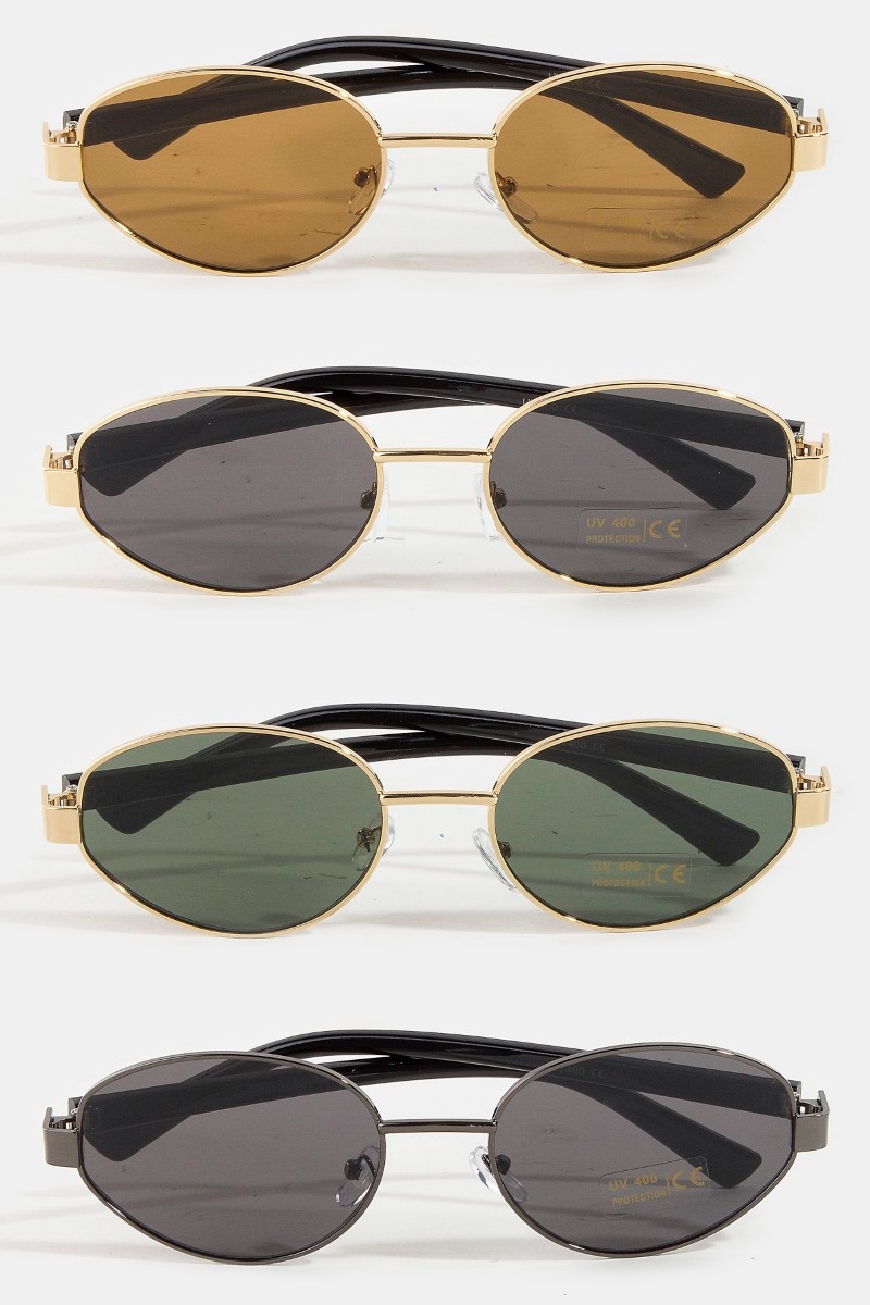 - This set of sunglasses features a fashionable twelve piece assorted oval metallic frame sunglasses style. Embark on a journey of sartorial refinement as this set of sunglasses effortlessly complements your fashion sense.