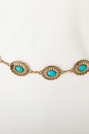 • This chain belt adds a modern floral turquoise concho disc style. Redefine your look effortlessly with this standout, on-trend piece.