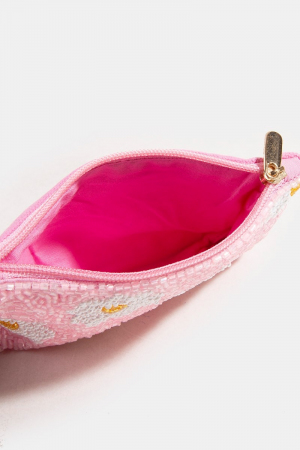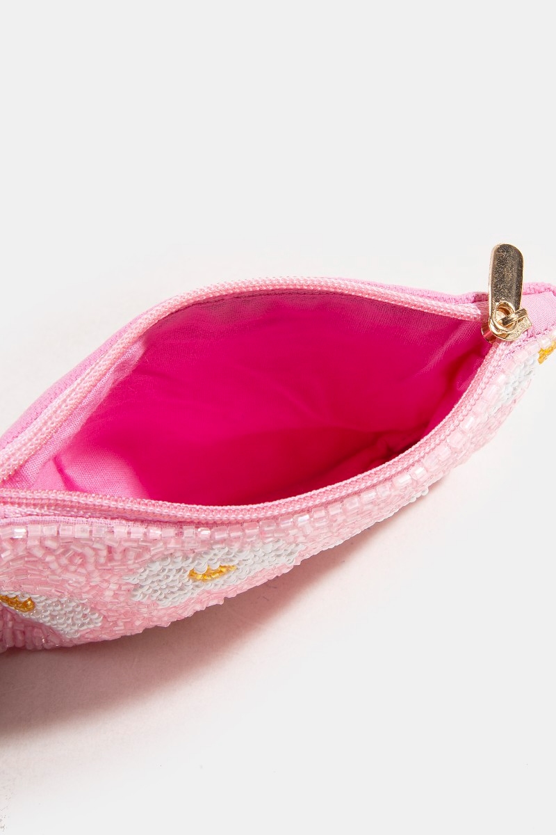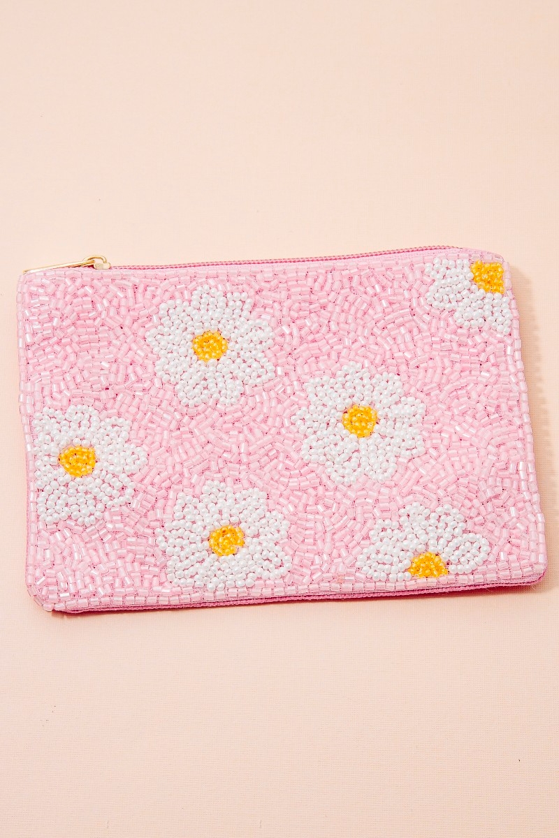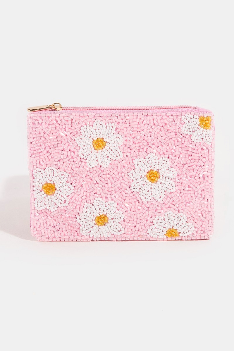 - This coin purse brings a unique daisy flowers pink seed beaded style. Discover the perfect balance of subtlety and flair as this coin purse effortlessly completes your look.