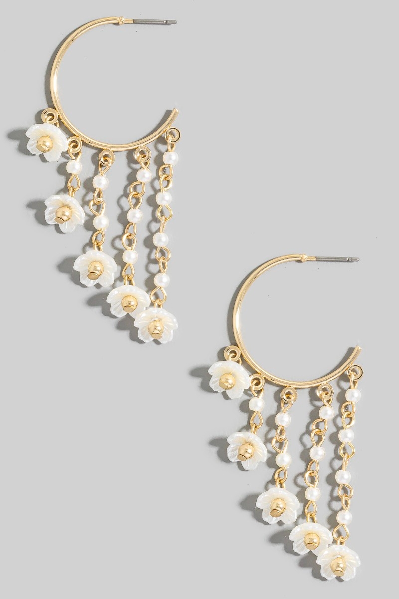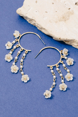 • This pair of hoop earrings introduces a stunning flower and pearl frigne style. Immerse yourself in the details of design, as this pair of hoop earrings effortlessly becomes a conversation starter.