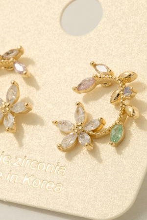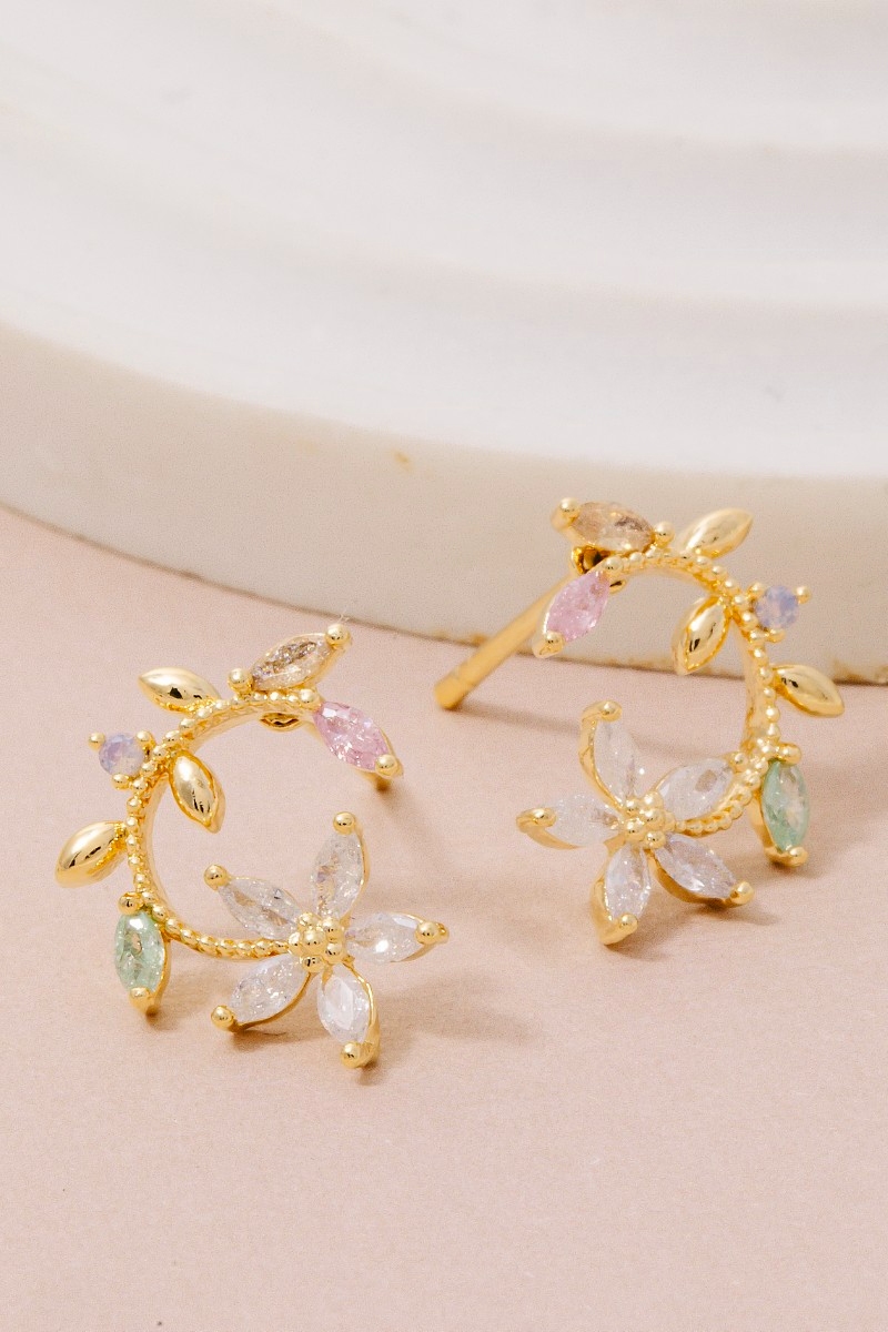 • This pair of stud earrings showcases a timeless gold dipped cubic zirconia leaf and flower circle style. Explore a blend of classic charm and contemporary flair.