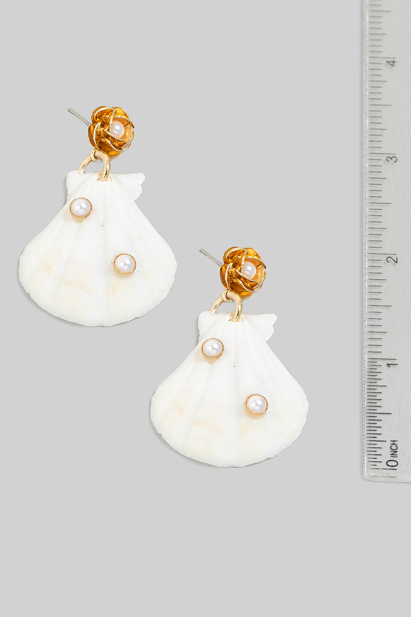 • This pair of dangle earrings showcases a unique metallic flower stud seashell style. Experience the joy of accessorizing with this piece that effortlessly combines versatility and charm.