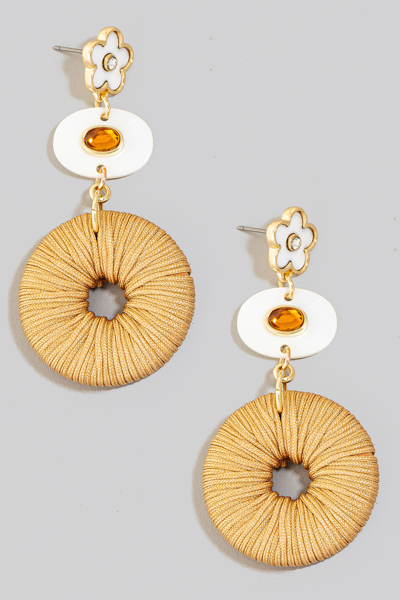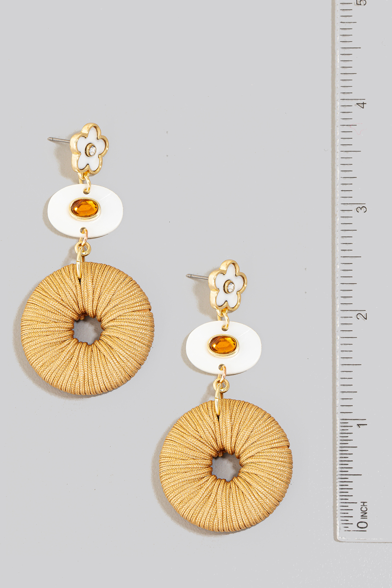 - This pair of dangle earrings showcases a timeless shell flower and oval thread wrapped hoop style. Unveil a new dimension of sophistication as this pair of dangle earrings effortlessly enhances the elegance of your ensemble.